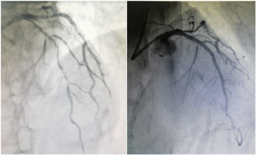 术前前降支血管严重狭窄(左) 术后管腔内无狭窄,恢复血流通畅(右)