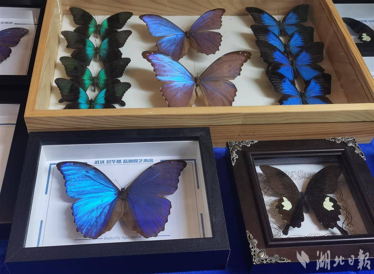 4月16日,湖北日报全媒记者走进该展馆,俨然进入了一个蓝色的童话世界、一个斑斓的蝴蝶标本海洋。枯叶蝶,全身呈古铜色,色泽和形态酷似一片枯叶;巴黎翠凤蝶,躯体黑褐色,散布绿色亮鳞,后翅上有一块蓝绿色亮斑;花冠闪蝶,平时比较少见,也是为数不多的银白色闪蝶……据介绍,该艺术馆于去年8月建成对外开放,日场门票仅需9.9元。目前馆内共引进了200多种海内外蝴蝶标本,并不断上新。标本中,以来自南美洲等地的偏蓝色系蝴蝶较为珍贵,包括翡翠凤蝶、晶闪蝶、天堂凤蝶等。