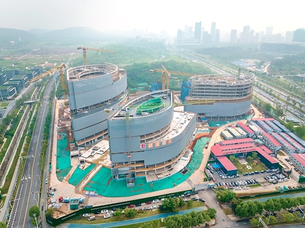 4月18日,俯瞰位于武汉市东湖高新区高新大道与光谷三路交会处的光谷文化中心项目。在航拍镜头中,项目主体建筑已经拔地而起,工程人员正在进行外立面及上部结构施工。