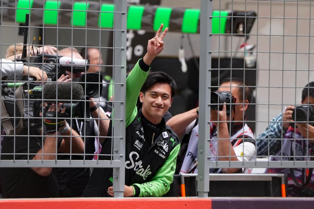 4月19日,索伯车队中国车手周冠宇(中)在练习赛前向观众致意。新华社记者 夏一方 摄