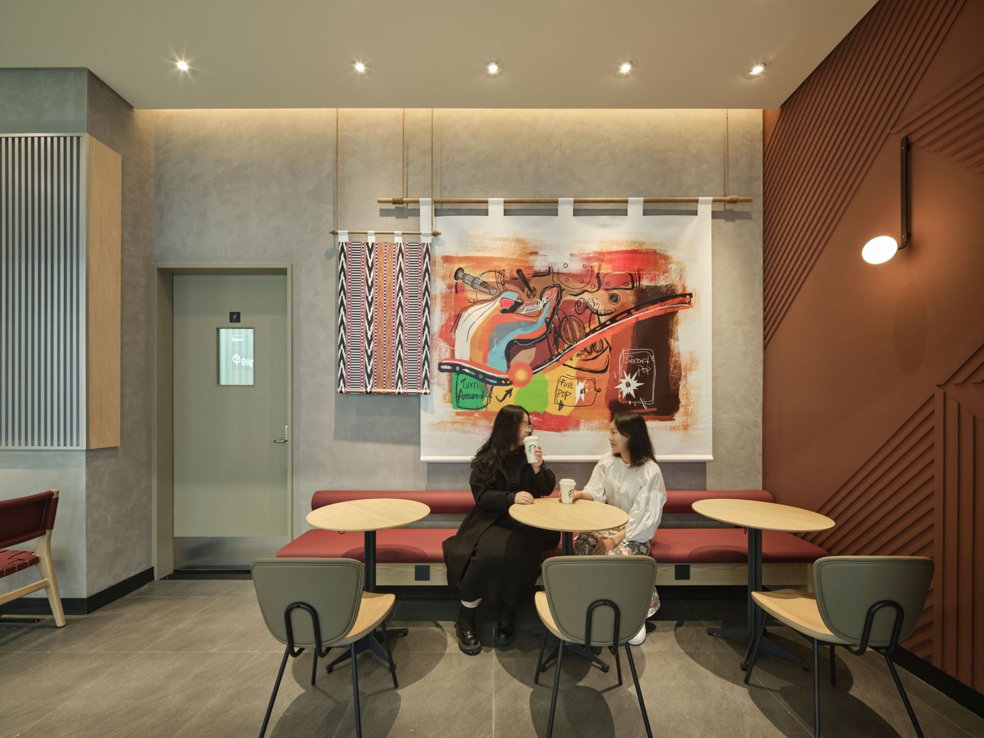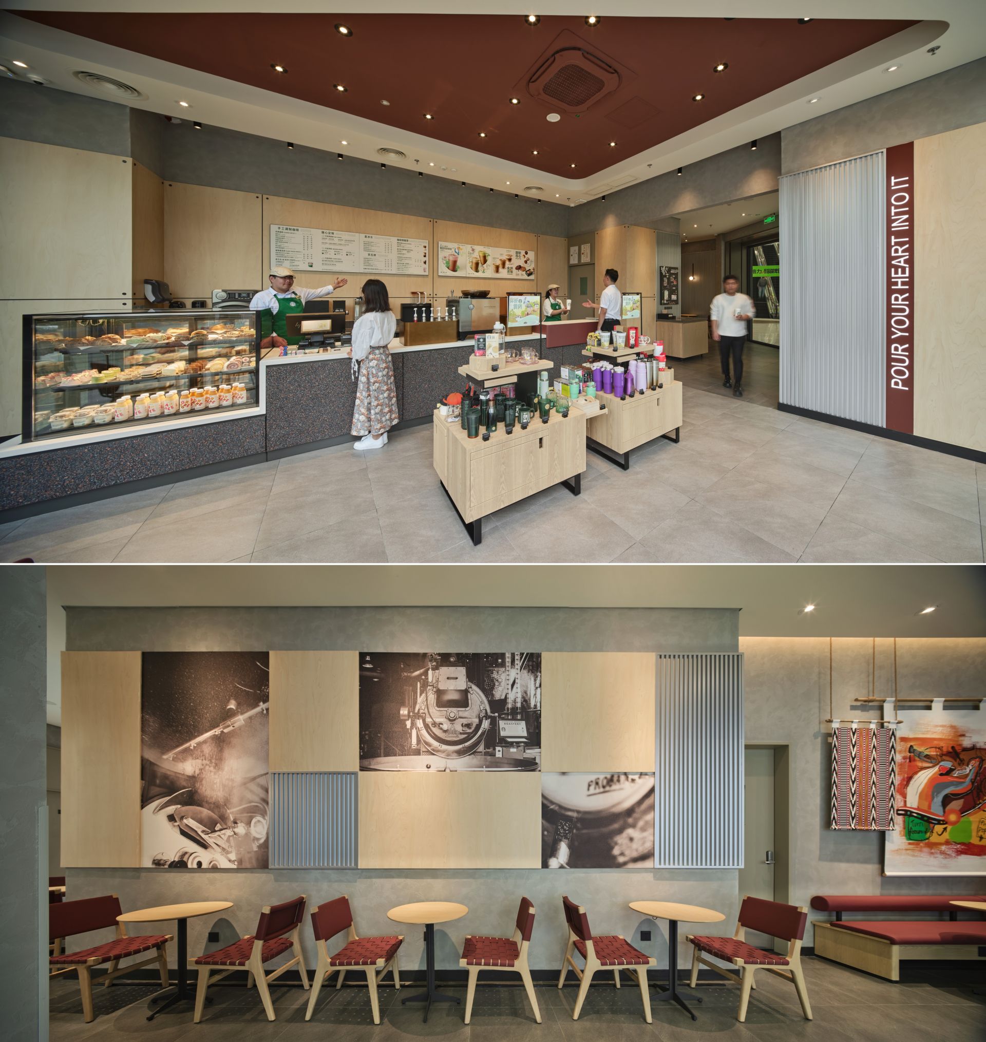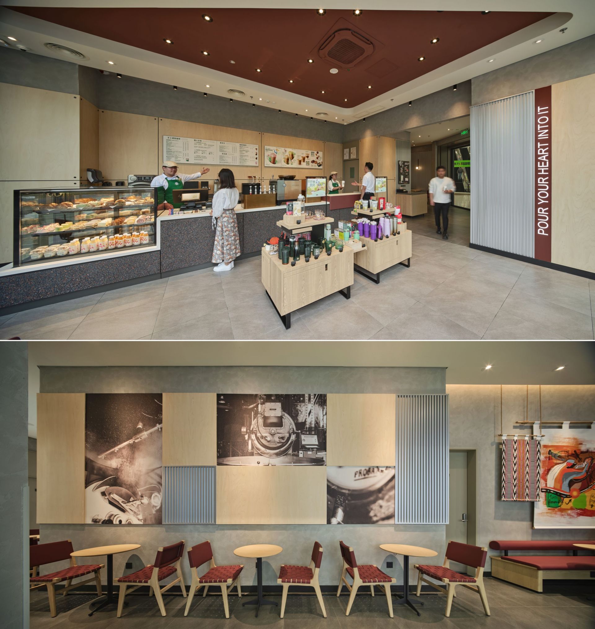 本次星巴克入驻黄冈,将陆续开出两家门店,两家门店在设计上都融入了当地元素。居然之家店巧妙地将大别山主峰景区的高低起伏形态融入墙面设计,仿佛将自然美景搬入店内;而万达门店则汲取东坡故居建筑精髓,通过壁画和空间几何造型,巧妙融合古今、中西文化,咖啡与城市的碰撞在此处绽放。在这里,无论是好友相聚、商务洽谈或者独处阅读,都能找到适合的空间。顾客还可以根据门店黑板提示报名参加咖啡教室,跟随咖啡师一起品鉴咖啡,探索一颗咖啡豆从种植、采摘、加工到成为手中这一杯的奇妙历程,在有趣的创意互动中探索咖啡故事。