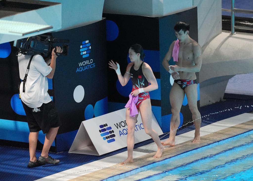 4月19日,陈芋汐(左)/杨昊在混合十米台比赛后。