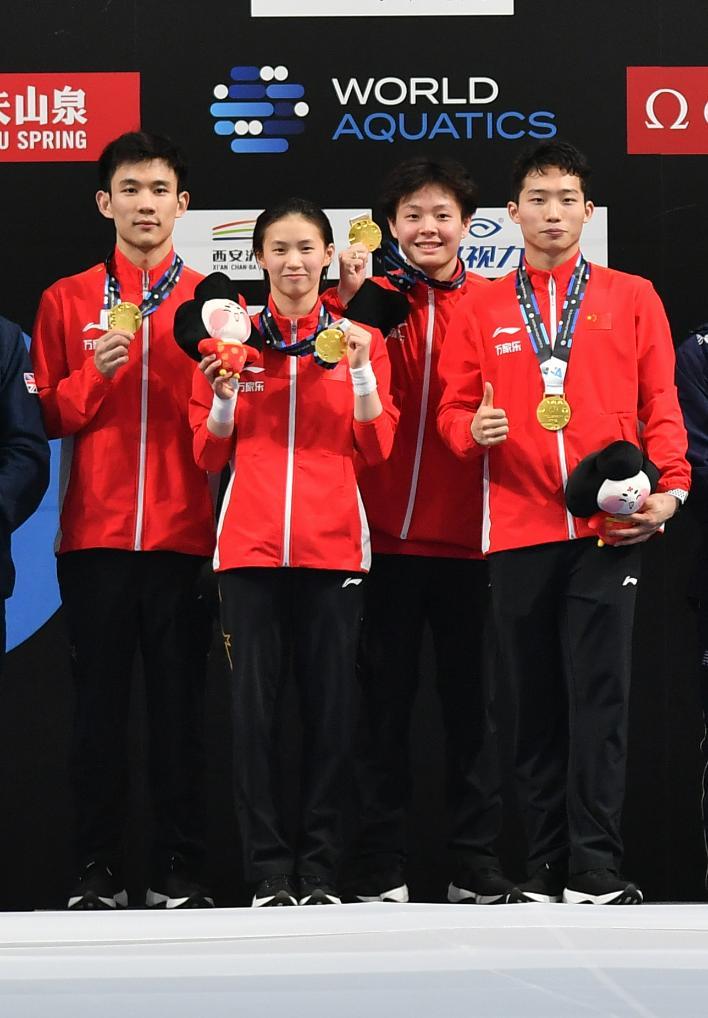 4月19日,中国队选手杨昊、陈芋汐、陈艺文、王宗源(从左至右)在颁奖仪式上。