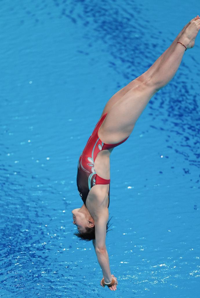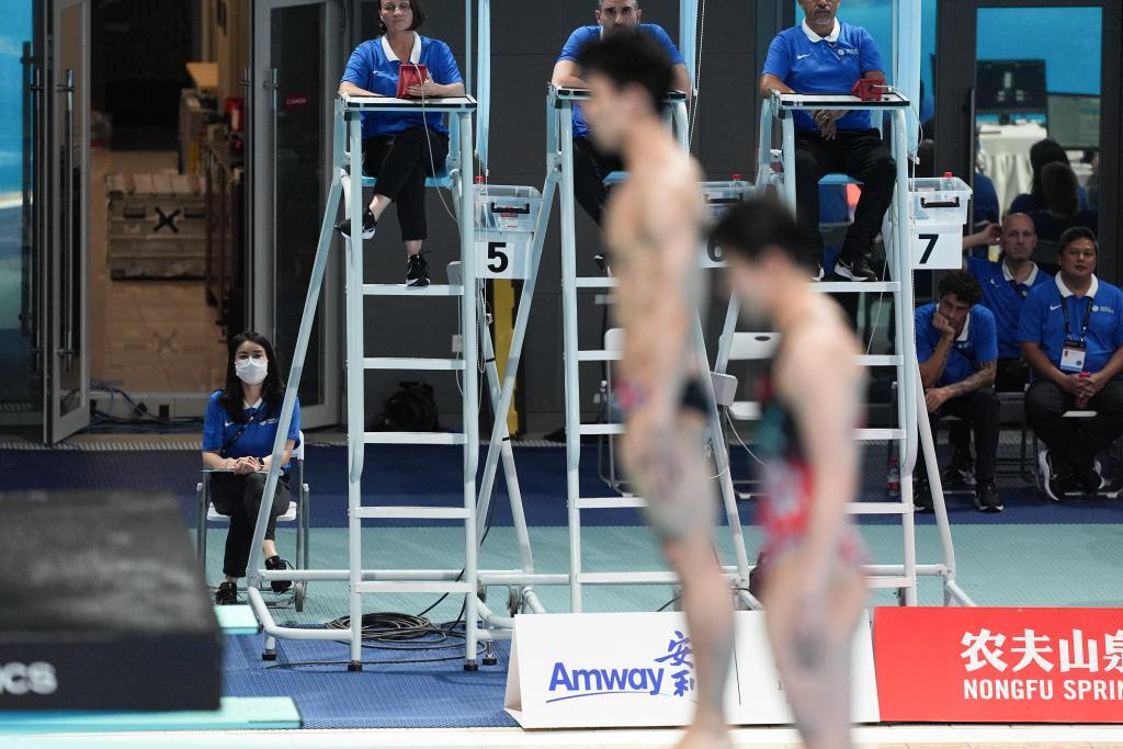 4月19日,世界泳联跳水技术委员会委员郭晶晶(左一)在场边观赛。