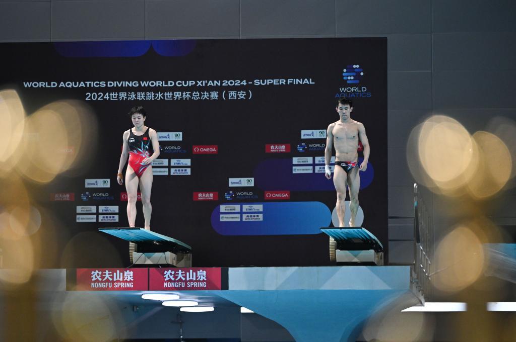 当日,在陕西西安举行的2024年跳水世界杯总决赛混合团体决赛中,由杨昊、陈芋汐、陈艺文、王宗源组成的中国队以500.75分的总成绩夺得冠军。新华社记者 张博文 摄pagebreak