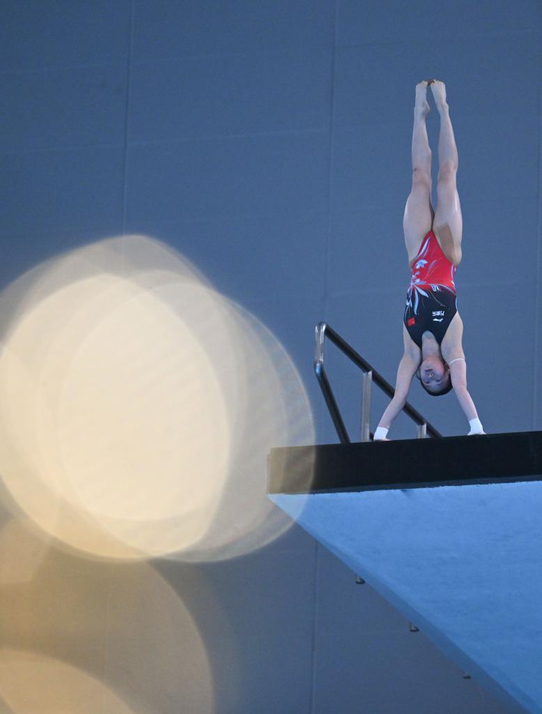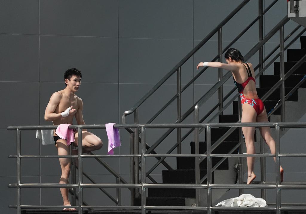 4月19日,陈芋汐(右)/杨昊在混合十米台比赛前热身。