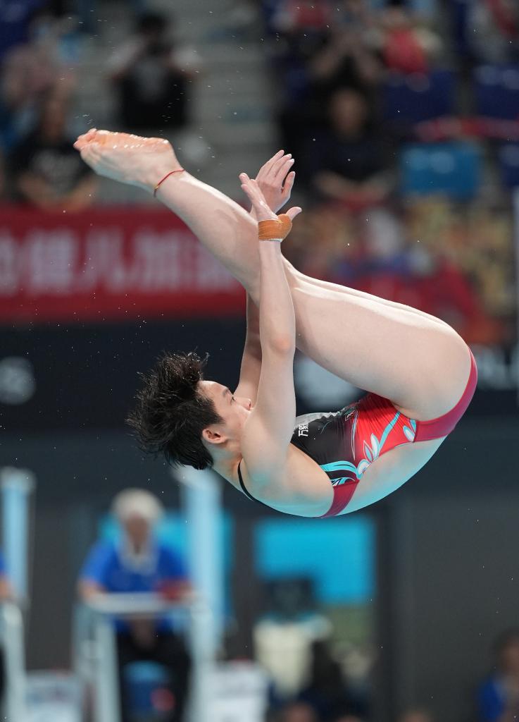 4月19日,陈芋汐(左)/杨昊在混合十米台比赛中。