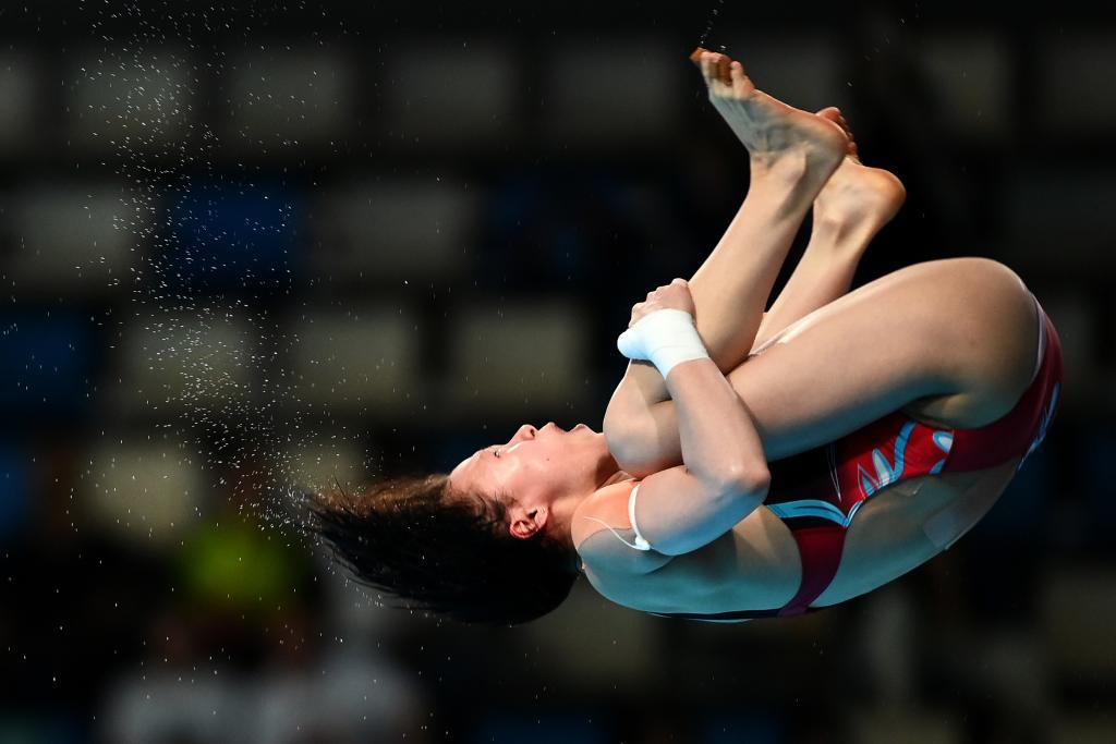 4月19日,陈艺文(左)/杨昊在混合三米板比赛中。