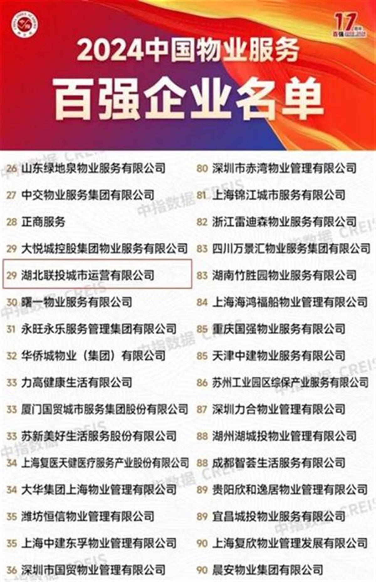 4月18日,“2024中国物业服务百强企业研究成果发布会暨第十七届中国物业服务百强企业家论坛”隆重召开。联投城市运营公司蝉联全国百强,位列湖北首位,接连荣膺“物业服务百强企业(TOP29)”“2024中国国有物业服务优秀企业”,实力“出圈”,美好赋能。