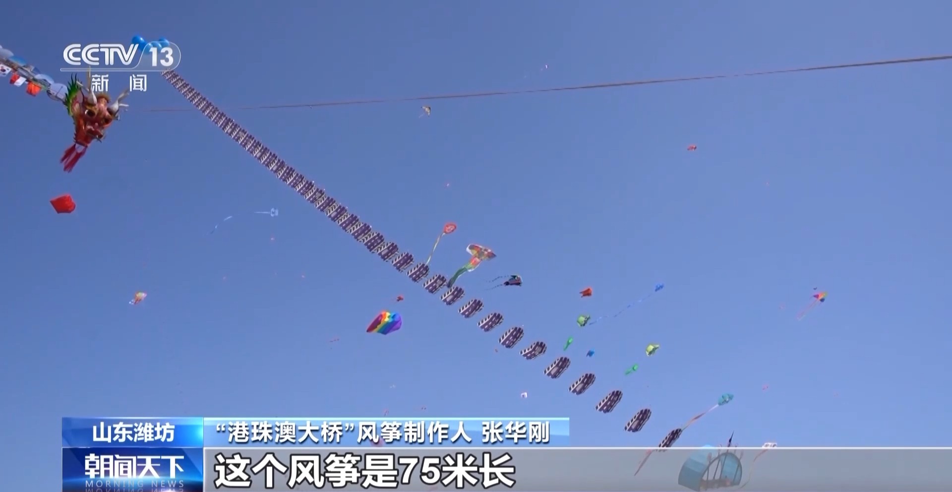 “港珠澳大桥”风筝制作人 张华刚:这个风筝是75米长,风筝的片数是41片,因为潍坊国际风筝会至今为止成功举办41届,也希望潍坊风筝节越办越好,越赛越高。