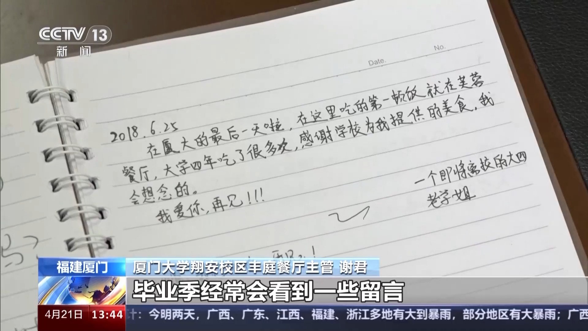 厦门大学翔安校区丰庭餐厅主管 谢君:毕业季经常会看到一些留言,有同学写说这是我在厦大的最后一天了,感谢食堂叔叔阿姨们把她养胖了,谢谢再见,我爱你们。看到这些我们就心里暖暖的,我们做的都是很平凡的小事,但是平凡的事重复做、坚持做,也可以成为有意义的事。