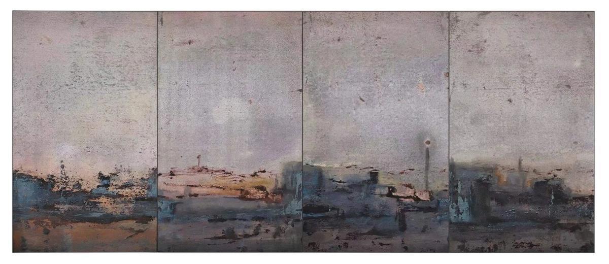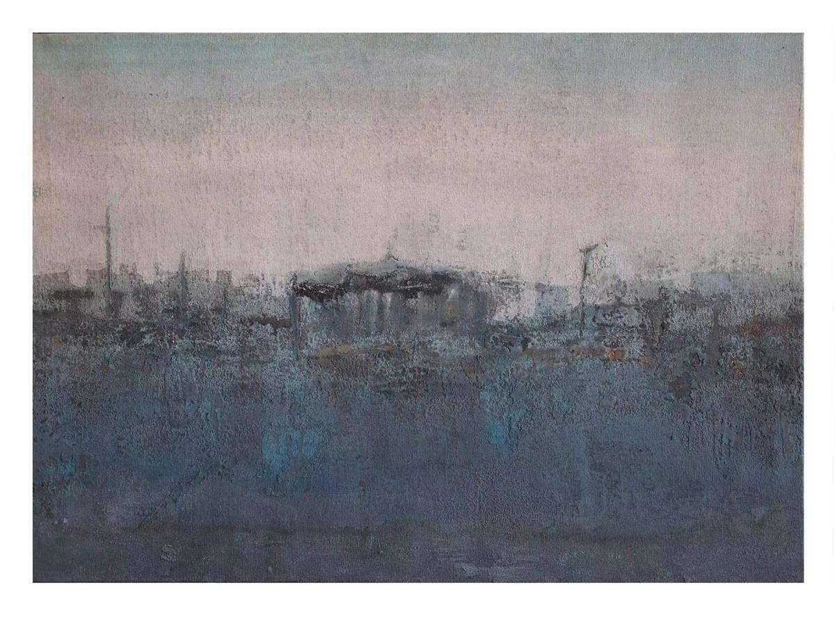 本次展览,展出了周吉荣不同时期的代表作品,呈现了艺术家表达手法上的演变。比如,早期他对北京胡同、街道生活的表现,房屋、人物都非常写实,通过构图、色块的夸张处理,来呈现对现实生活的思考。后来,他使用综合材料,逐渐脱离了形的束缚,表现手法更为抽象,如《海市蜃楼》系列、《绮城》系列……可以看到作品中几乎无形可辨认,一切物品都以模糊的方式呈现,似有似无,用色则更为深淳稳健,加上纸浆等材料制造的丰富肌理,画面显得既华丽又梦幻,既熟悉又有距离感。