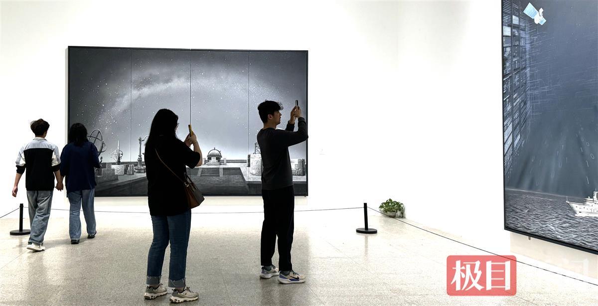在展览现场,极目新闻记者发现,周吉荣的部分作品颇受年轻观众喜爱,如颇具梦幻感的《海市蜃楼》系列、《绮城》系列,科技感十足的《中国天眼》,带着多重影像叠加效果的《景观》系列……年轻人们不仅举着相机、手机频频拍照,在喜欢的作品前留影,更有一些人明显“有备而来”,或拿着花束等道具,或按设计好的pose,在展厅里完成打卡。