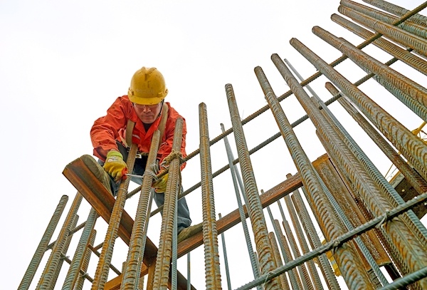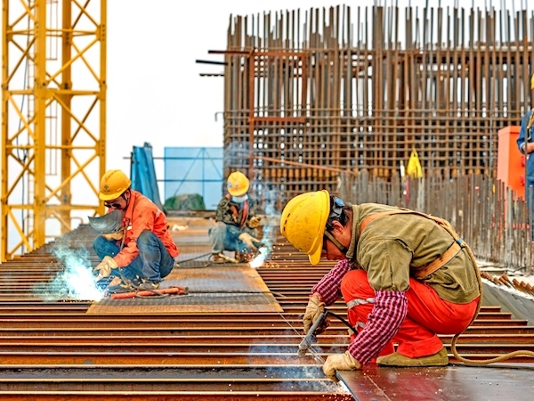 只见工人师傅们忙着绑扎钢筋,他们或“骑”在钢筋上,用铁丝固定;或手握焊接枪,让钢筋连接得更紧密……