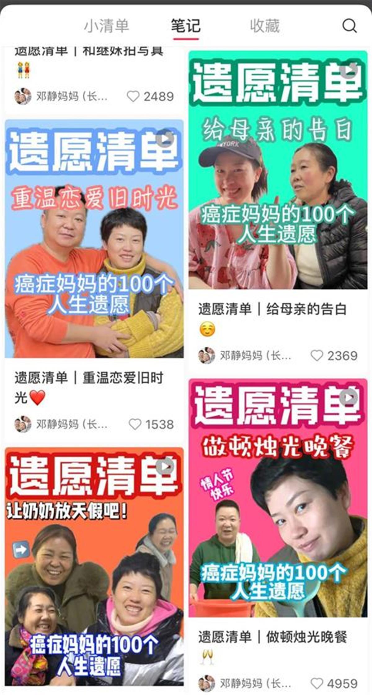 但是邓静在视频中所呈现的样子,并不像一般人印象中的“癌症晚期患者”,留着短发的她看上去温柔又干练,时常爽朗灿烂的笑着,散发出一种不会疲倦的活力,她和家人一起爬山坐缆车;陪大儿子逛街,满足他的所有心愿;跟母亲讲心里话,两人一起出门祈福;在情人节给老公做一顿烛光晚餐……在那些剪辑手法简单,封面、文案都直白质朴的视频中,她记录着自己完成一个个“遗愿”的步骤,像是一步步挥别自己的人生,弥补曾经的空缺,以充实而有意义的余生,给家人留下美好的回忆。