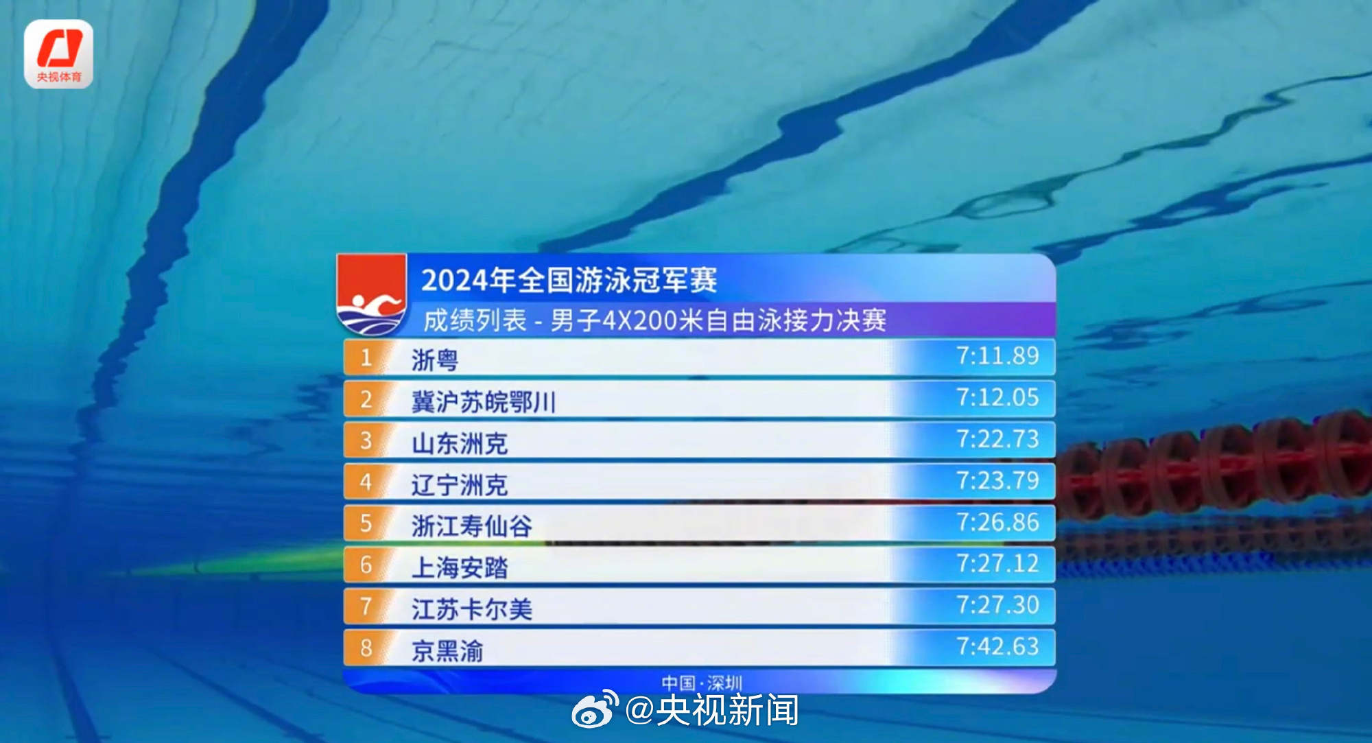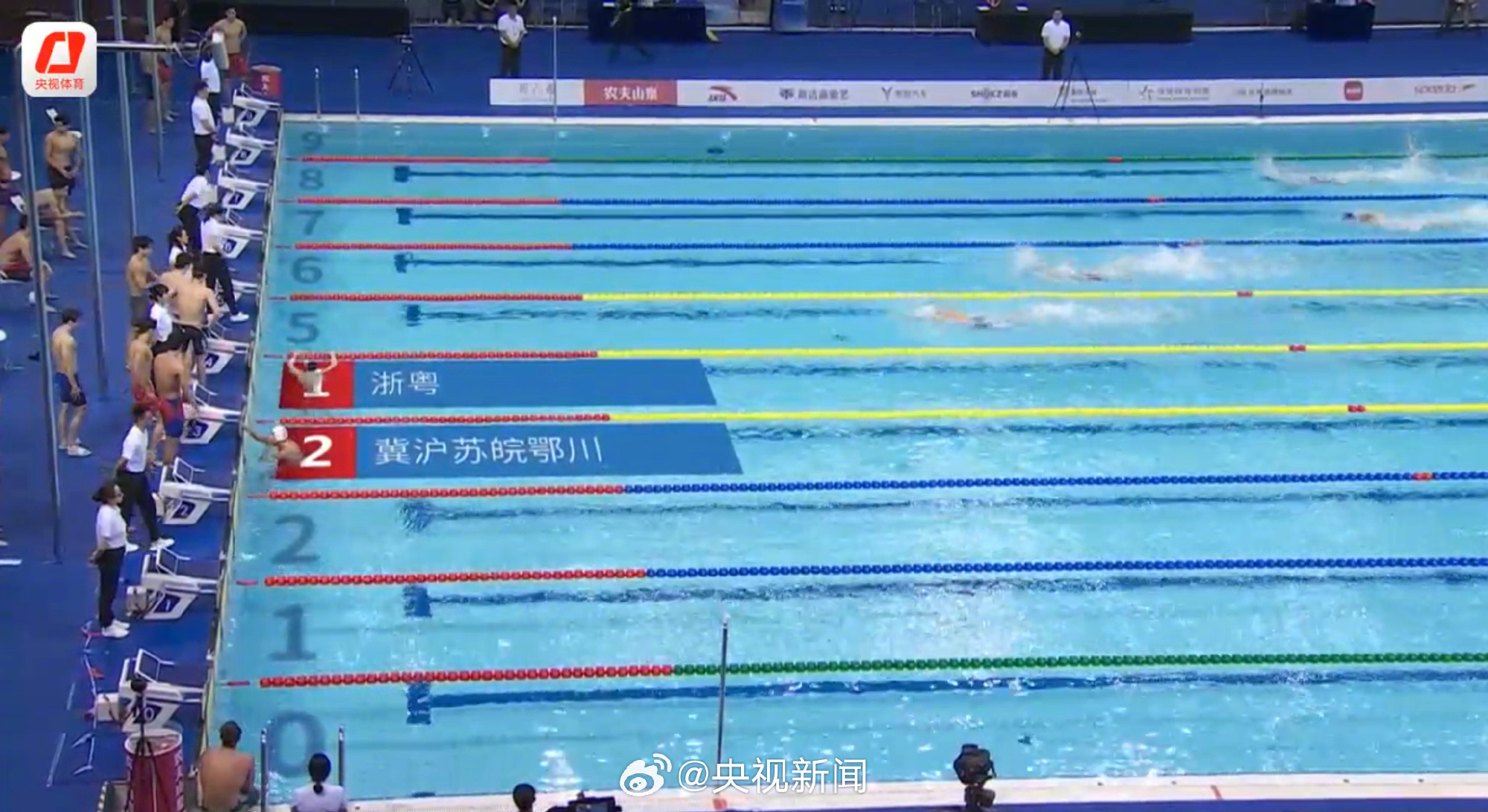 男子4x200米自由泳接力决赛,由潘展乐领衔的浙粤联队以7分11秒89夺冠。