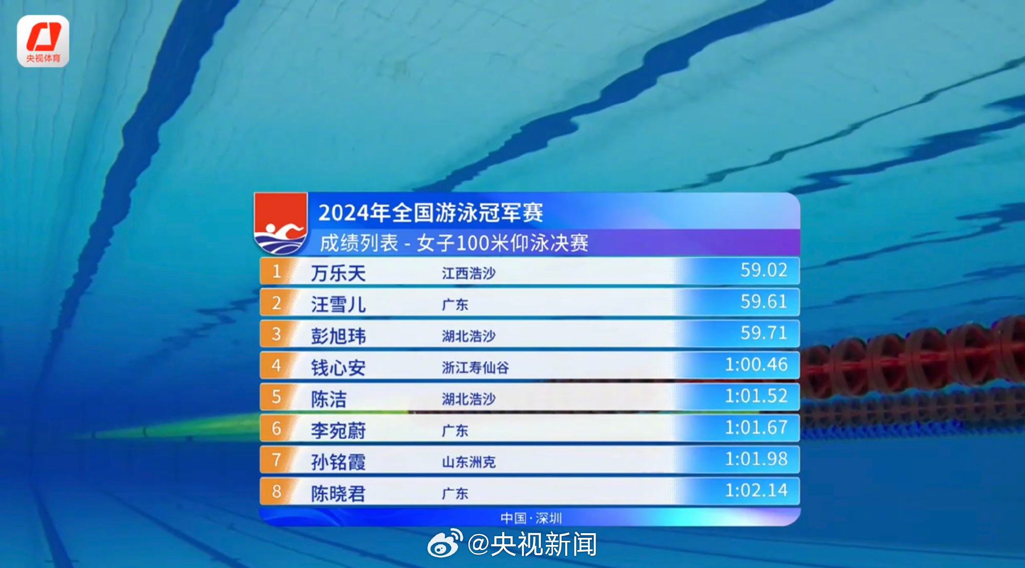 女子100米仰泳决赛,万乐天以59秒02创个人最佳成绩夺冠,汪雪儿以59秒61排名第二,彭旭玮以59秒71排名第三,前三名的成绩都达到了奥运A标。