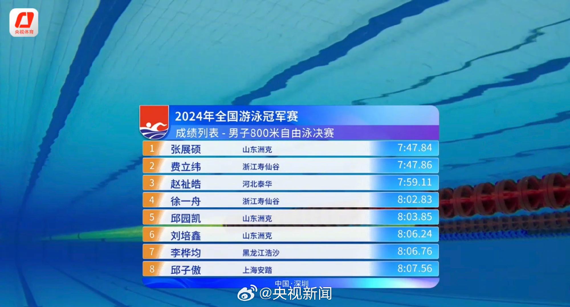 男子800米自由泳决赛,张展硕以7分47秒84夺冠,费立纬以7分47秒86获得亚军,二人都创造了个人最好成绩并达到奥运A标。