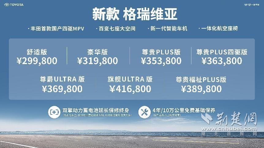 荆楚网(湖北日报网)讯(记者王博 通讯员姚敬)4月18日,丰田首款国产四驱MPV--新款格瑞维亚正式上市,新车共发布7款车型,售价为29.98万元-41.68万元。其中,尊贵PLUS版在现款基础上不仅再降3000元,还增加了价值万元的智能配置,包括最新一代车机系统,人性化的HUD抬头显示功能、12.3英寸全液晶仪表盘,并可以选装一体化航空座椅。尊贵PLUS四驱版售价仅比尊贵PLUS版上浮一万元,满足了用户既追求平稳舒适,又注重品质出行的诉求。此外,舒适版定价更是比现款车型售价直降1.6万元,首次进入30万元价格区间,让更多用户可以轻松拥抱高品质的大七座MPV,带上全家,满爱出发。