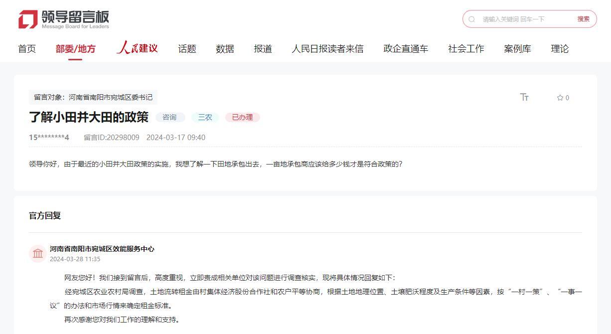 “目前,多地实施小田并大田政策。我想了解一下,家里的田地承包出去,一亩地给多少补贴符合政策?”最近,南阳一网民留言询问此事。