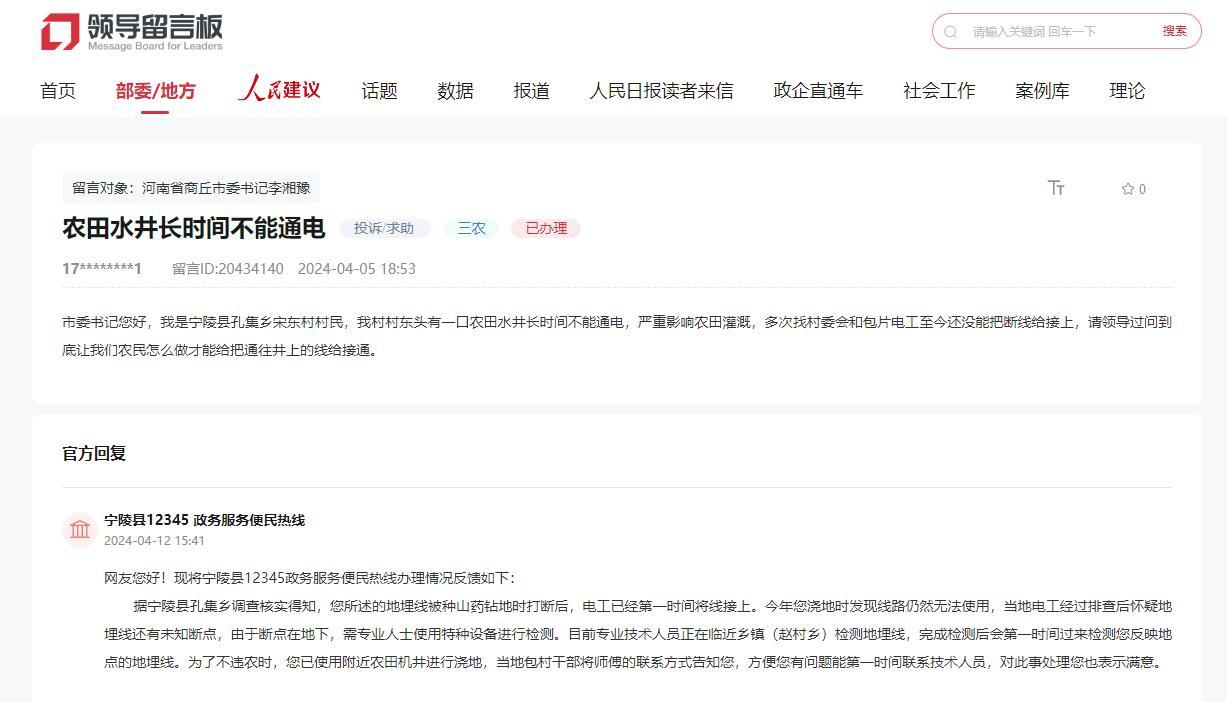 回复还称,经过排查,疑似地埋线还有未知断点,专业技术人员正在邻近乡镇(赵村乡)检测地埋线,完成检测后会第一时间过来检测。为了不违农时,当地包村干部进行沟通协调,目前,该网民已使用附近农田机井进行浇地。