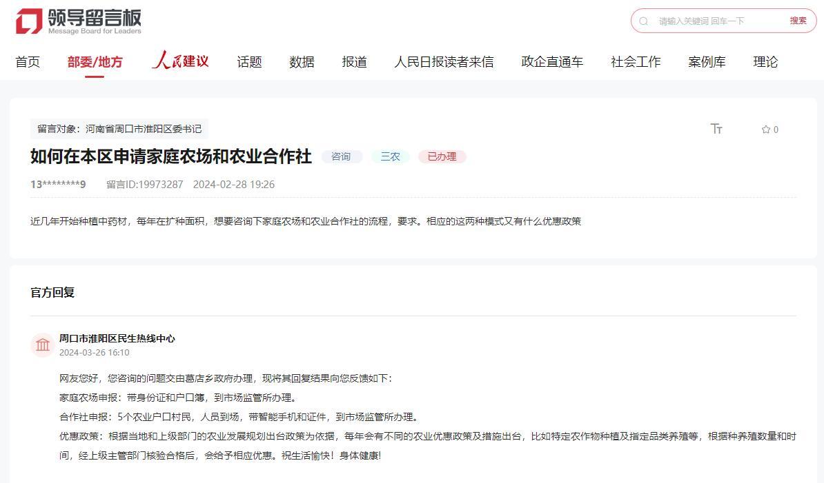 “这几年家里开始种植中药材,每年都在扩大种植面积。不知申请家庭农场和农业合作社的流程和要求是什么?这两种模式国家有哪些政策支持?”最近,周口网民张先生通过人民网“领导留言板”询问。
