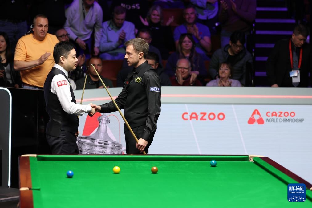 4月24日,丁俊晖(左)与利索夫斯基在比赛后相互致意。新华社发(翟政摄)