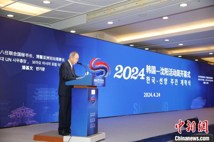 图为联合国前秘书长潘基文在开幕式致辞。沈阳市商务局 供图