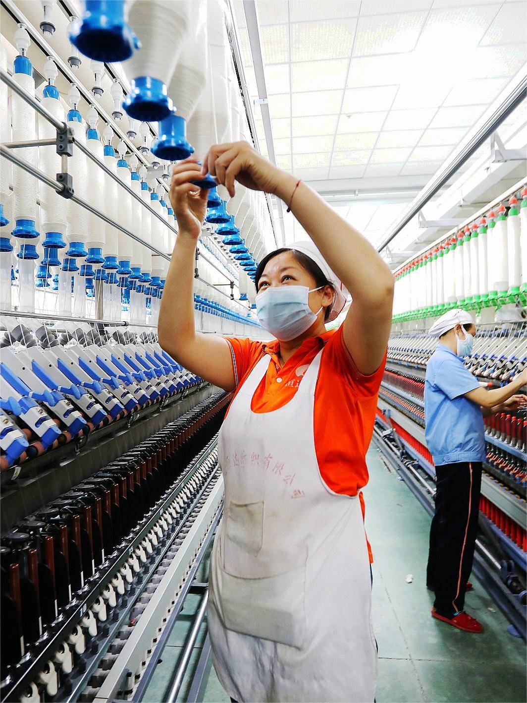 在十堰市房县恒达纺织有限公司,工人在纺织车间生产高端紧密纺纱线。(视界网 张启龙 摄)