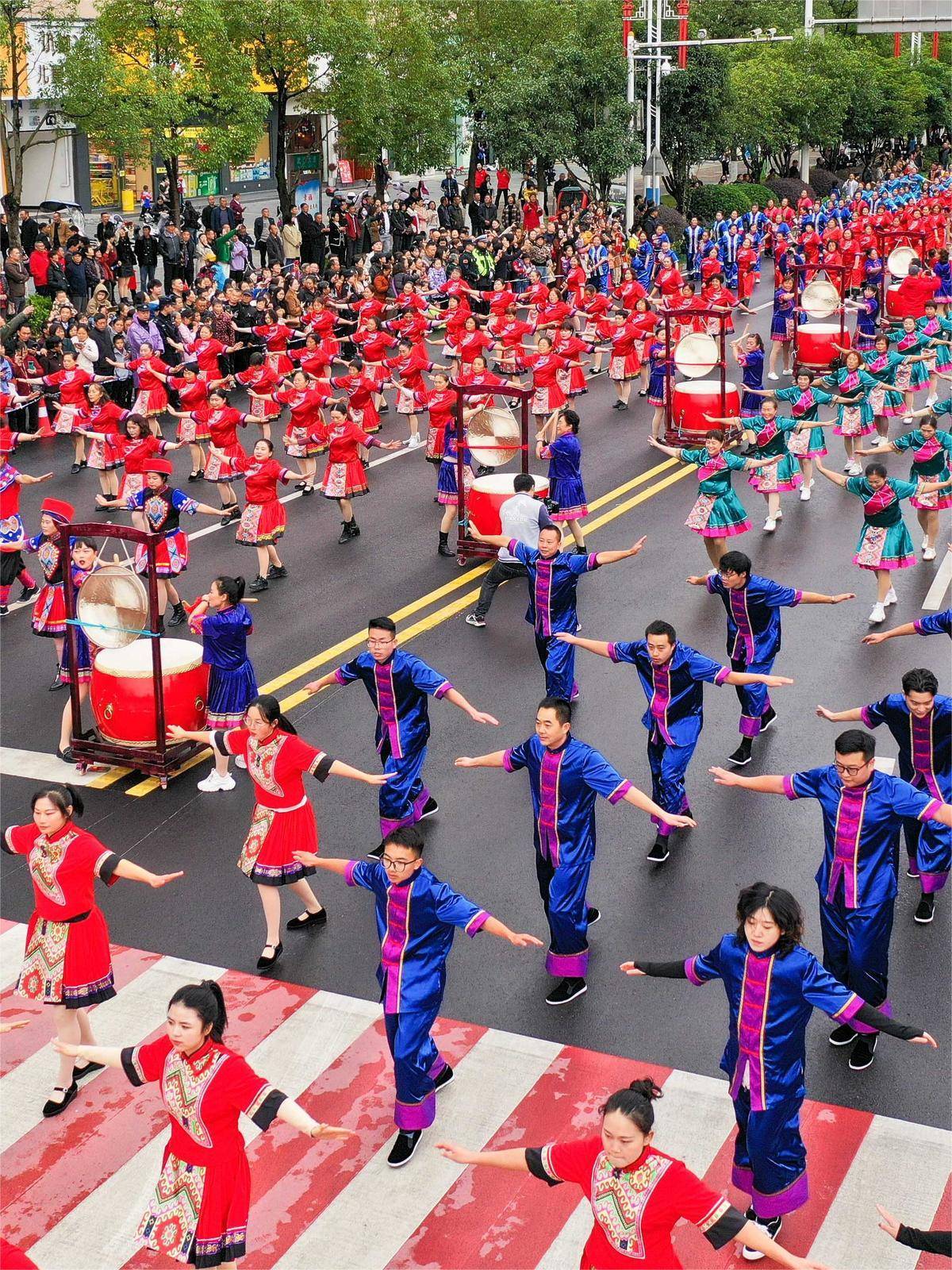 鼓点落,铜锣响。4月20日,来凤县举行“文化记忆非遗行”特色非遗巡游活动,土家摆手舞等非遗项目一一上演,激昂的鼓点和豪迈的舞姿,搅热整座县城。