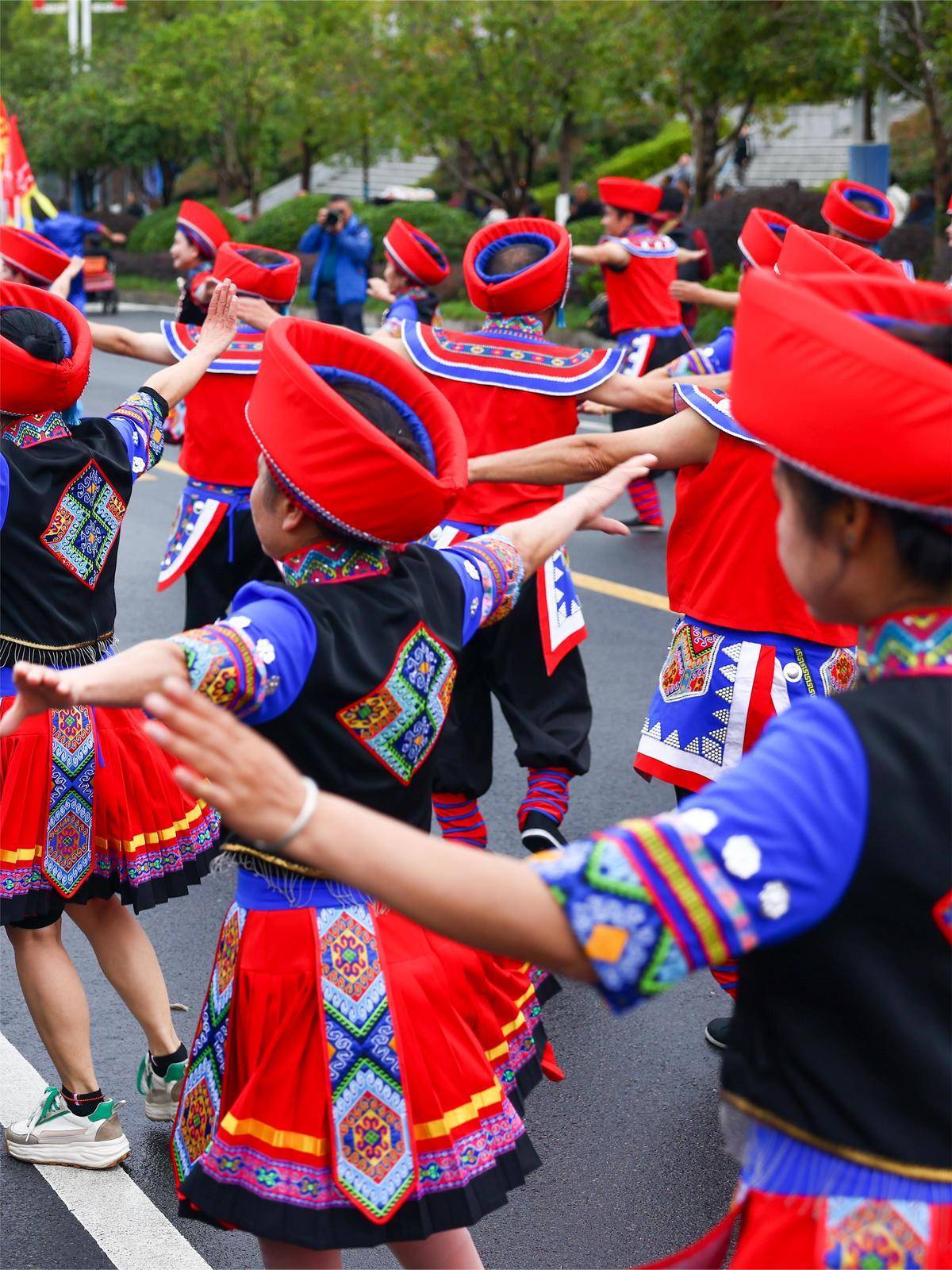 土家儿女身穿五颜六色的民族服饰,跳起土家摆手舞。(湖北日报全媒记者 蔡俊 摄)