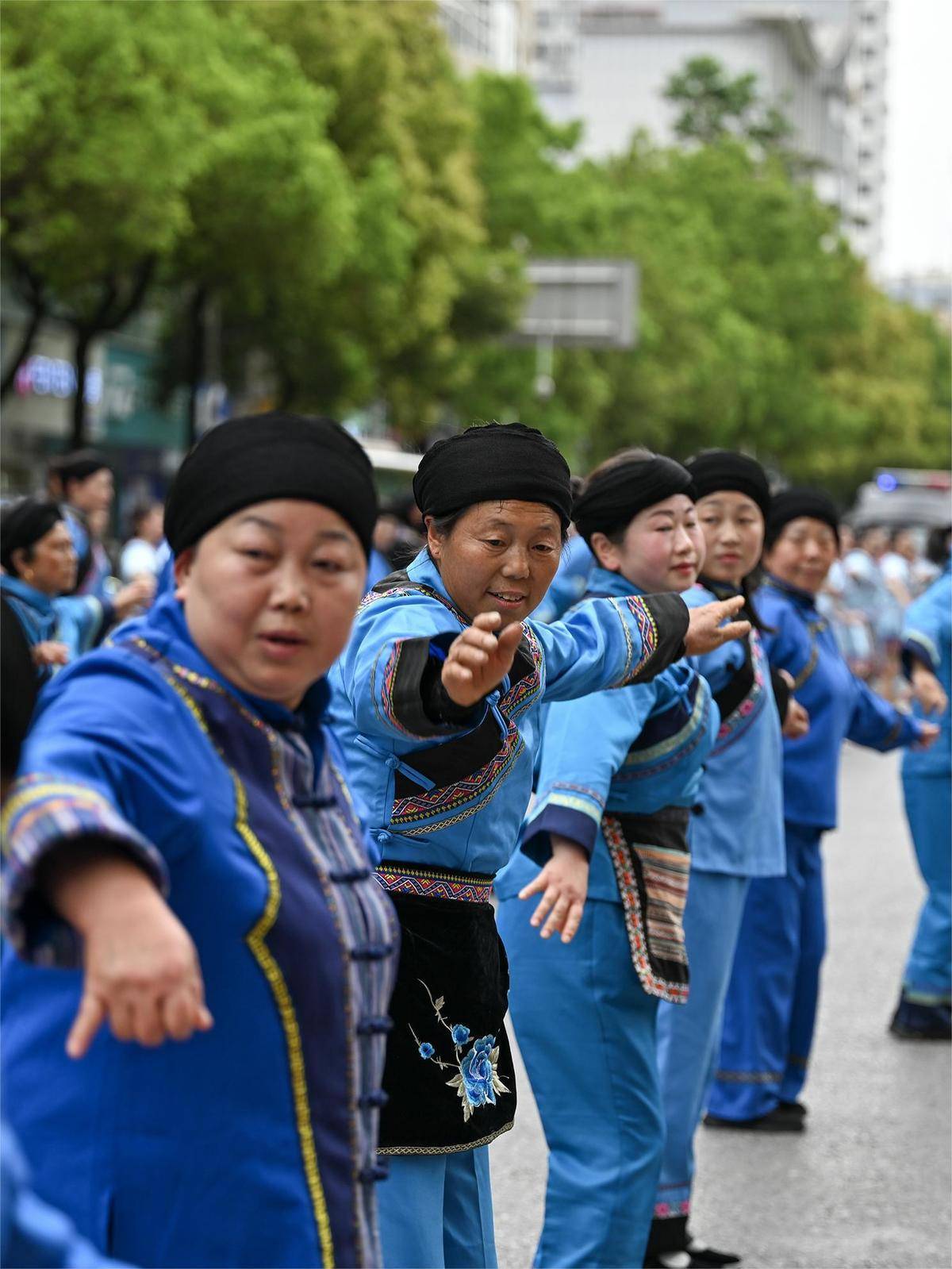 4月20日,来凤县举行“文化记忆非遗行”特色非遗巡游活动,百福司镇舍米湖村村民跳起土家摆手舞。(通讯员 唐俊 摄)