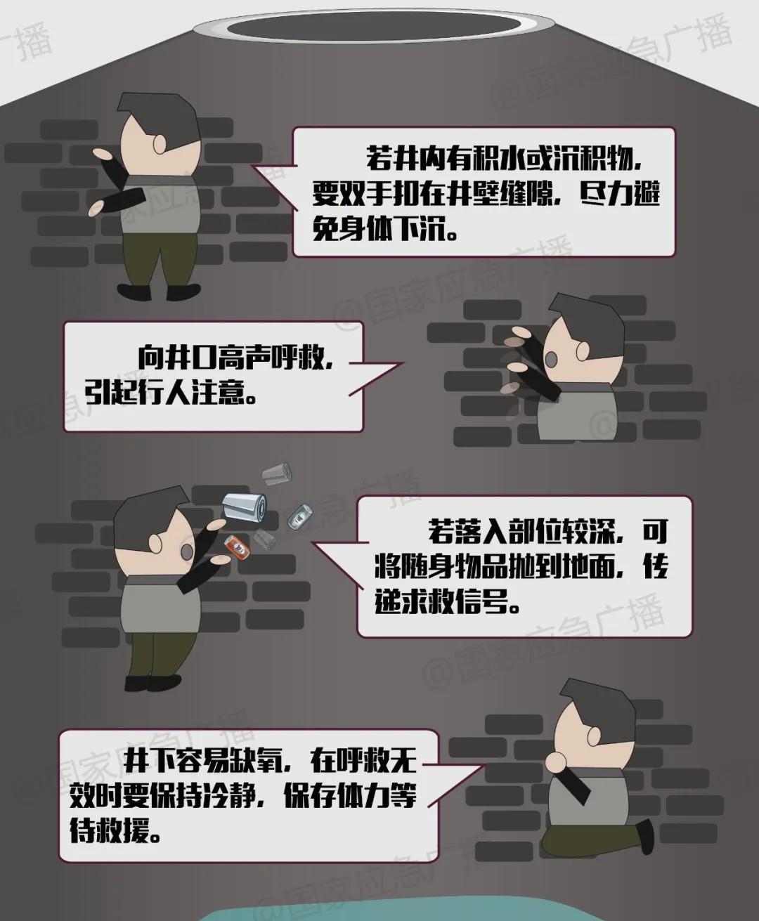 市政管井中,有些井里没有水,但有的井里积水很深,甚至是污水。万一掉进有水的井里,惊慌大叫,可能导致呛水窒息,要先确保自己别呛水。呼救也要讲技巧↓