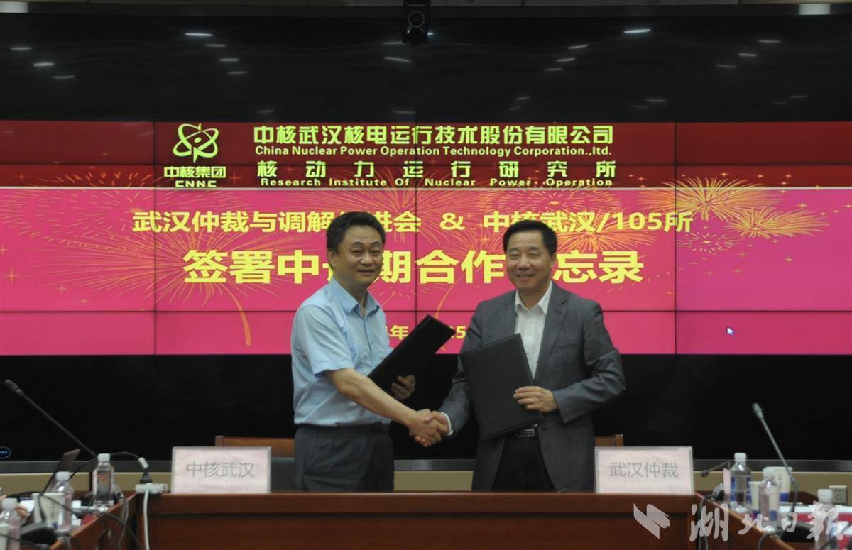 活动现场,武汉仲裁委员会国际商事调解中心与中核武汉核电运行技术股份有限公司/核动力运行研究所签订战略合作备忘录。