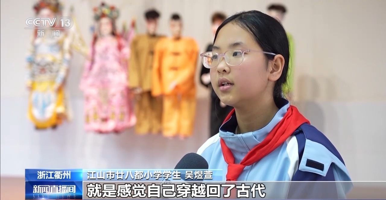 江山市廿八都小学学生 吴煜萱:每次牵着木偶上台的时候,感觉自己穿越回了古代,感觉很有趣。开始的时候唱腔要和木偶的动作相结合,比较难,但是经过一年多的练习,越来越熟练了。表演的过程中,我也深深地感受到了中华优秀传统文化的魅力。