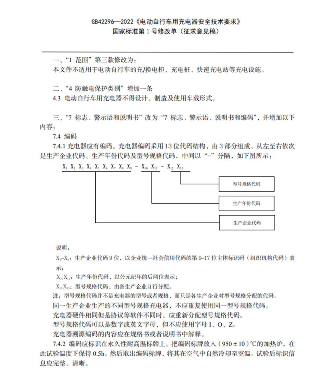 在工信部公示的《电动自行车用充电器安全技术要求》强制性国家标准第1号修改单(征求意见稿)中,拟要增加编码内容即完善永久性标识内容,其中提到充电器编码采用13位代码结构,由3部分组成,从左至右依次是生产企业代码为9位,以企业统一社会信用代码的第9至17位主体标识码(组织机构代码)表示;生产年份代码为2位,以公元纪年的后两位表示;型号规格代码为2位,由各生产企业自行分配。编码应标识在永久性耐高温标牌上。把编码标牌放入(950±10)℃的加热炉,在此试验温度下保持0.5小时,然后取出编码标牌,将其在空气中自然冷却至室温。试验后标识信息应完整、清晰。