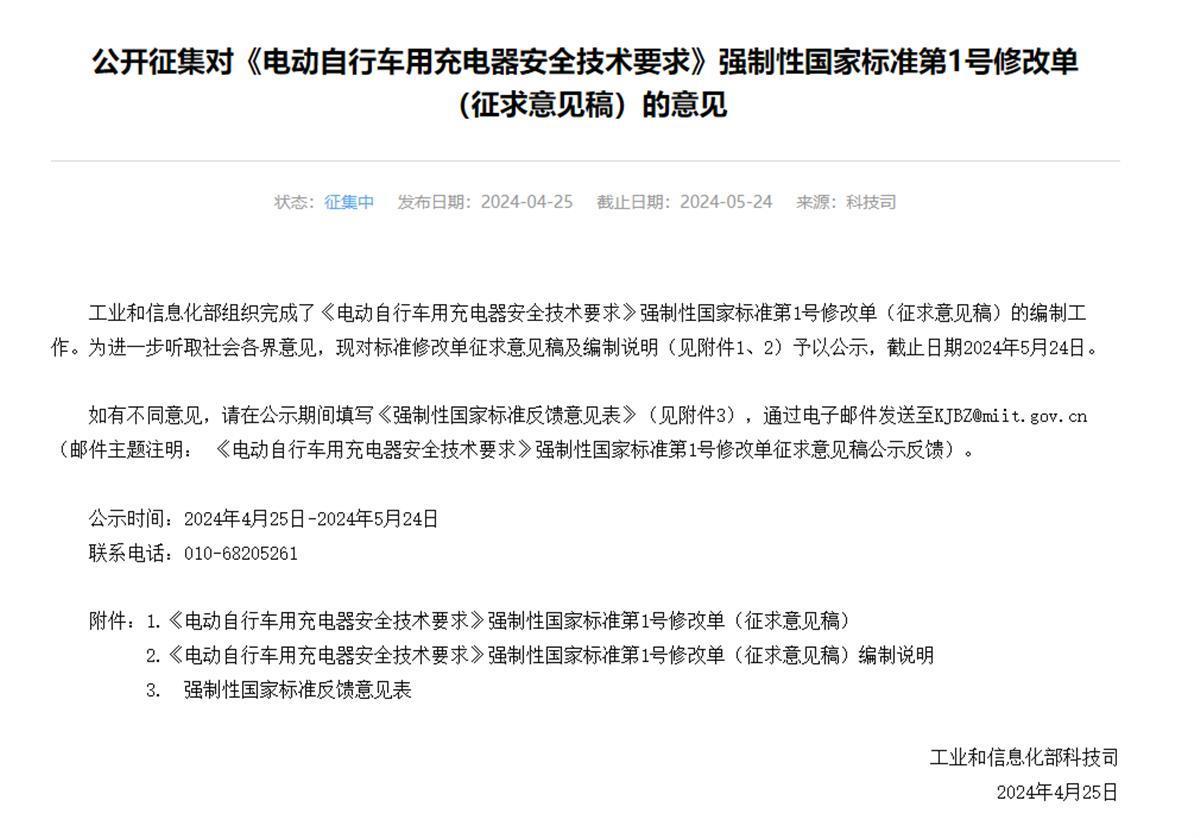 工信部公开征集对《电动自行车用充电器安全技术要求》强制性国家标准第1号修改单(征求意见稿)的意见(官网截图)