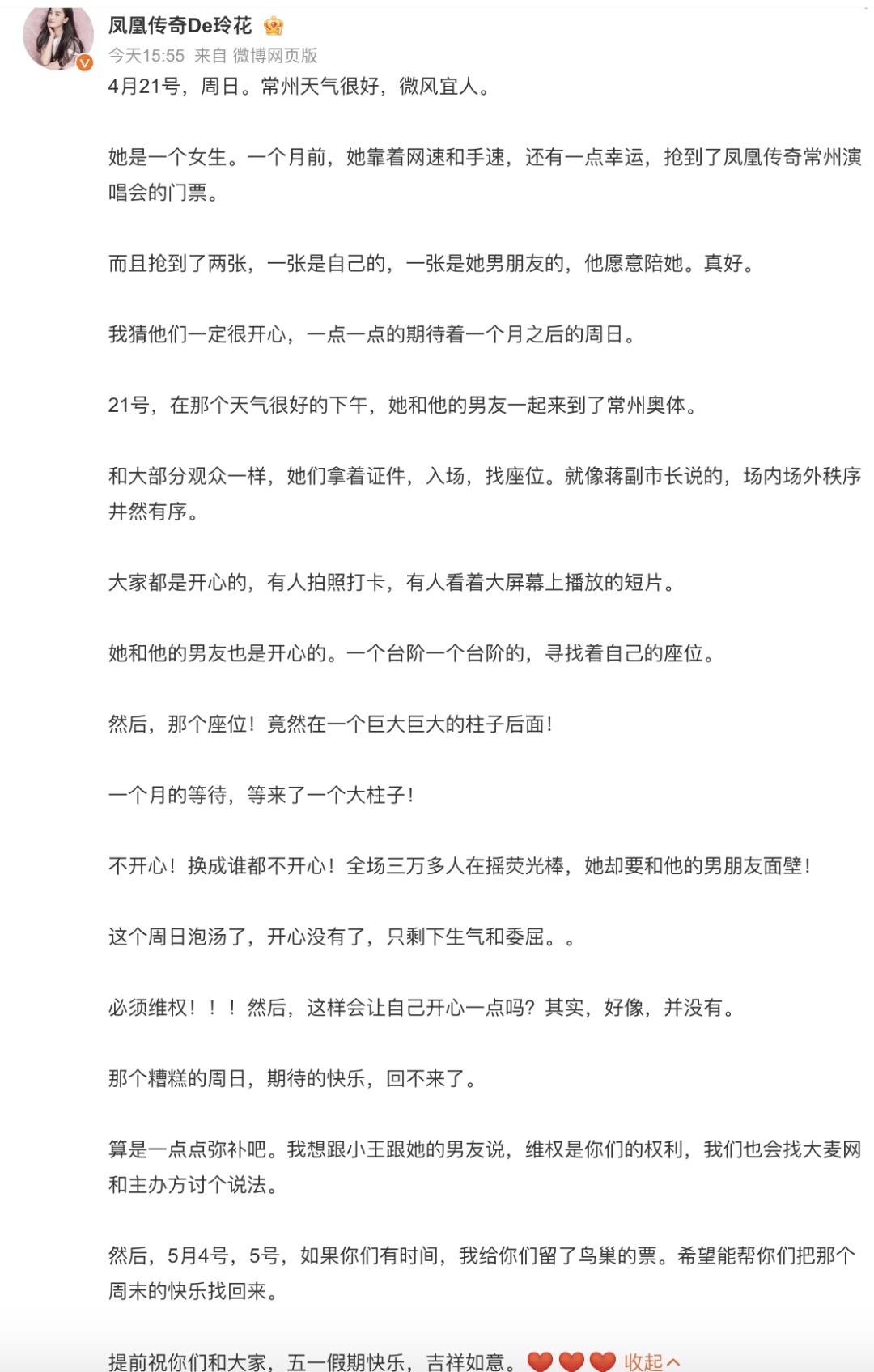 玲花还承诺该女生,“5月4号,5号,如果你们有时间,我给你们留了鸟巢的票。希望能帮你们把那个周末的快乐找回来。”