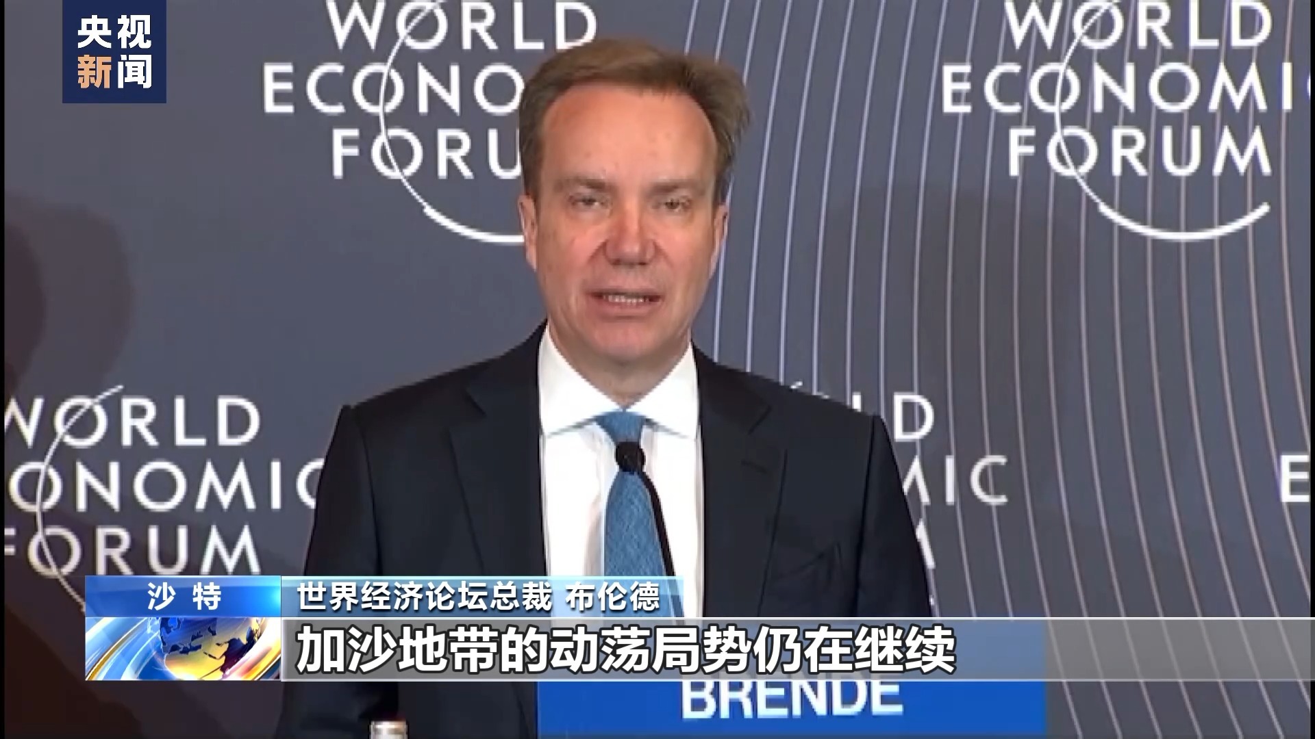世界经济论坛总裁 布伦德:当我们此刻坐在利雅得时,加沙地带的动荡局势仍在继续,人道主义形势堪忧。我们在这里将会重点讨论如何缓解中东地区的冲突,以及加沙地带不断恶化的人道主义形势。