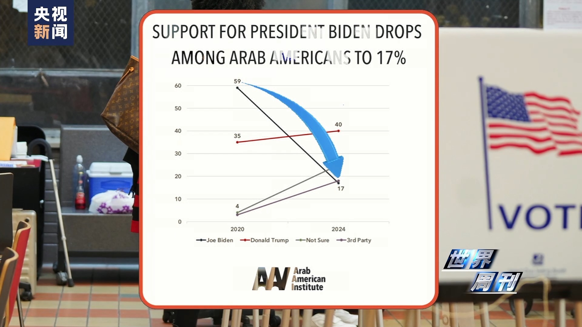 “阿拉伯裔美国人研究所”的数据也显示,新一轮巴以冲突爆发后,拜登在阿拉伯裔选民中的支持率已由2020年的59%暴跌至17%。