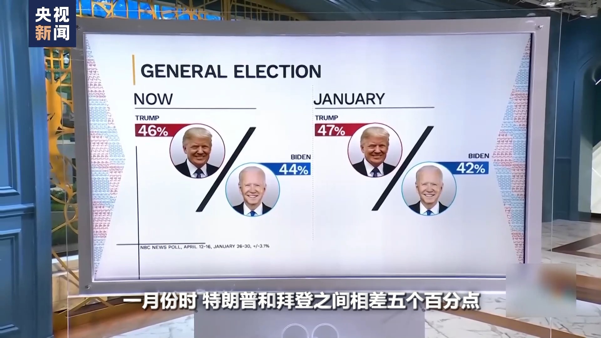 美国全国广播公司主播:拜登总统正在缩小与前总统特朗普的差距。在二人对决中,特朗普以46%对44%领先拜登两个百分点。一月份时,特朗普和拜登之间相差五个百分点。
