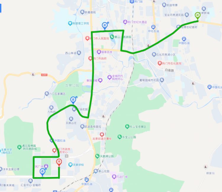 东宝中学→天鹅小区南方向:月亮湖路(东宝中学)→长宁大道→象山二路→象山大道→天鹅路→双喜大道→天山路→漳河大道→天鹅路(天鹅小区南);