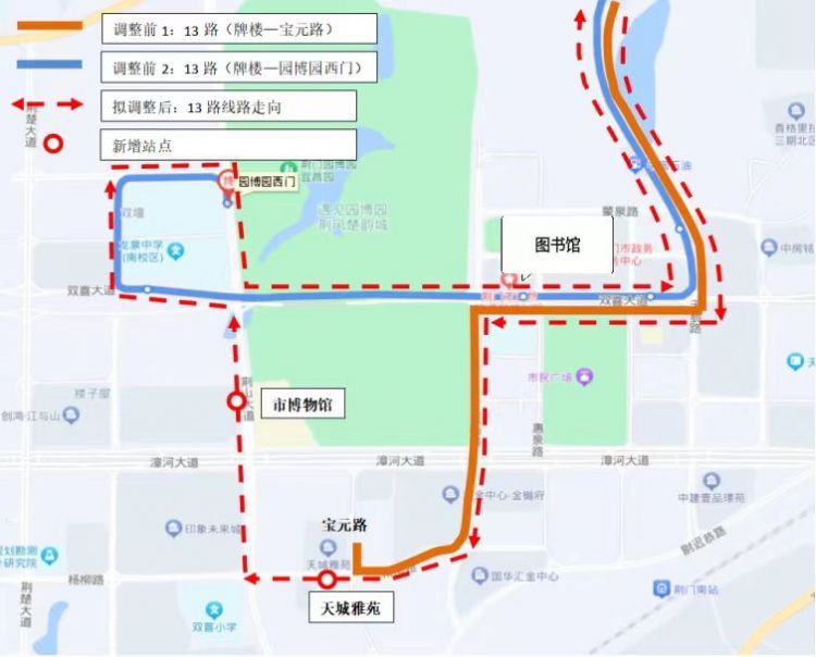 园博园西门→市图书馆(双喜大道)→牌楼,市图书馆(双喜大道)→牌楼原走向不变。