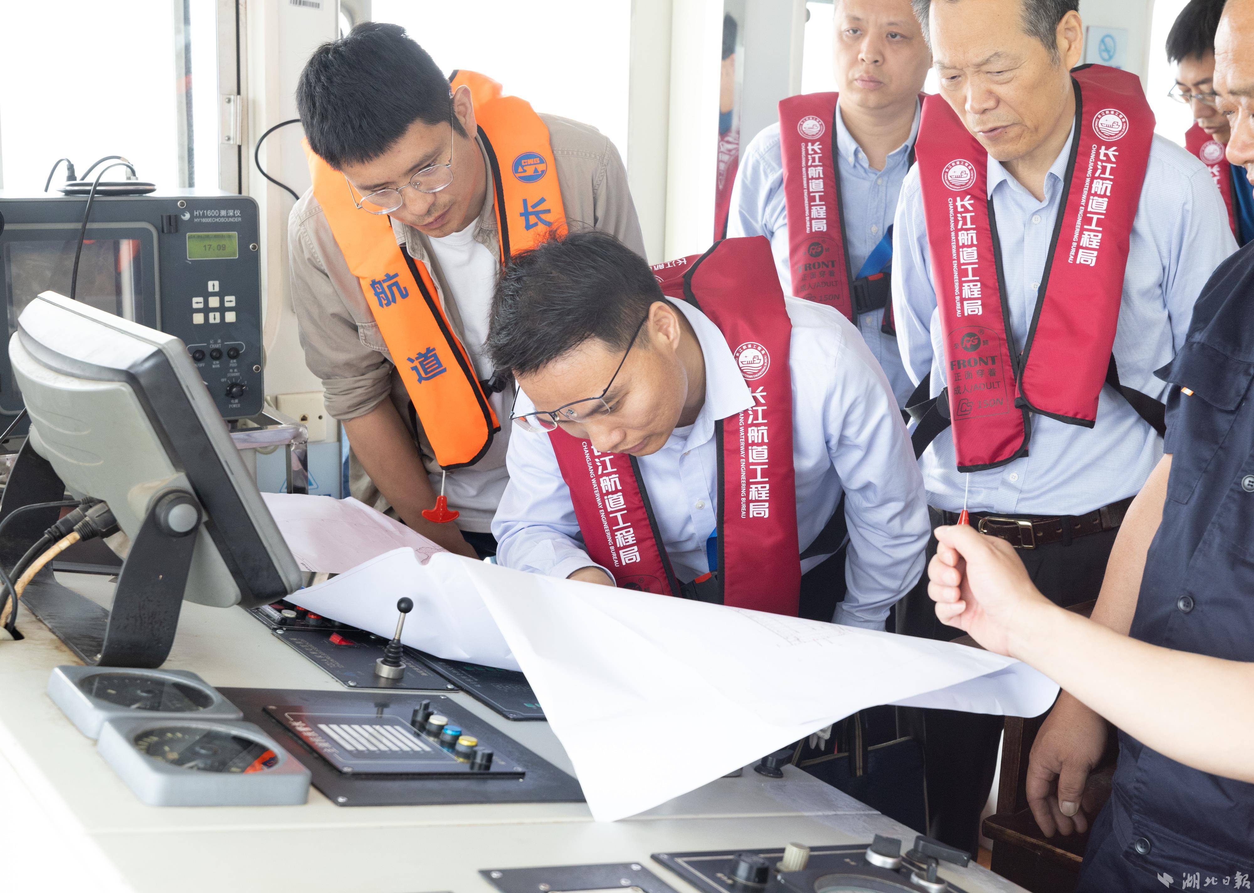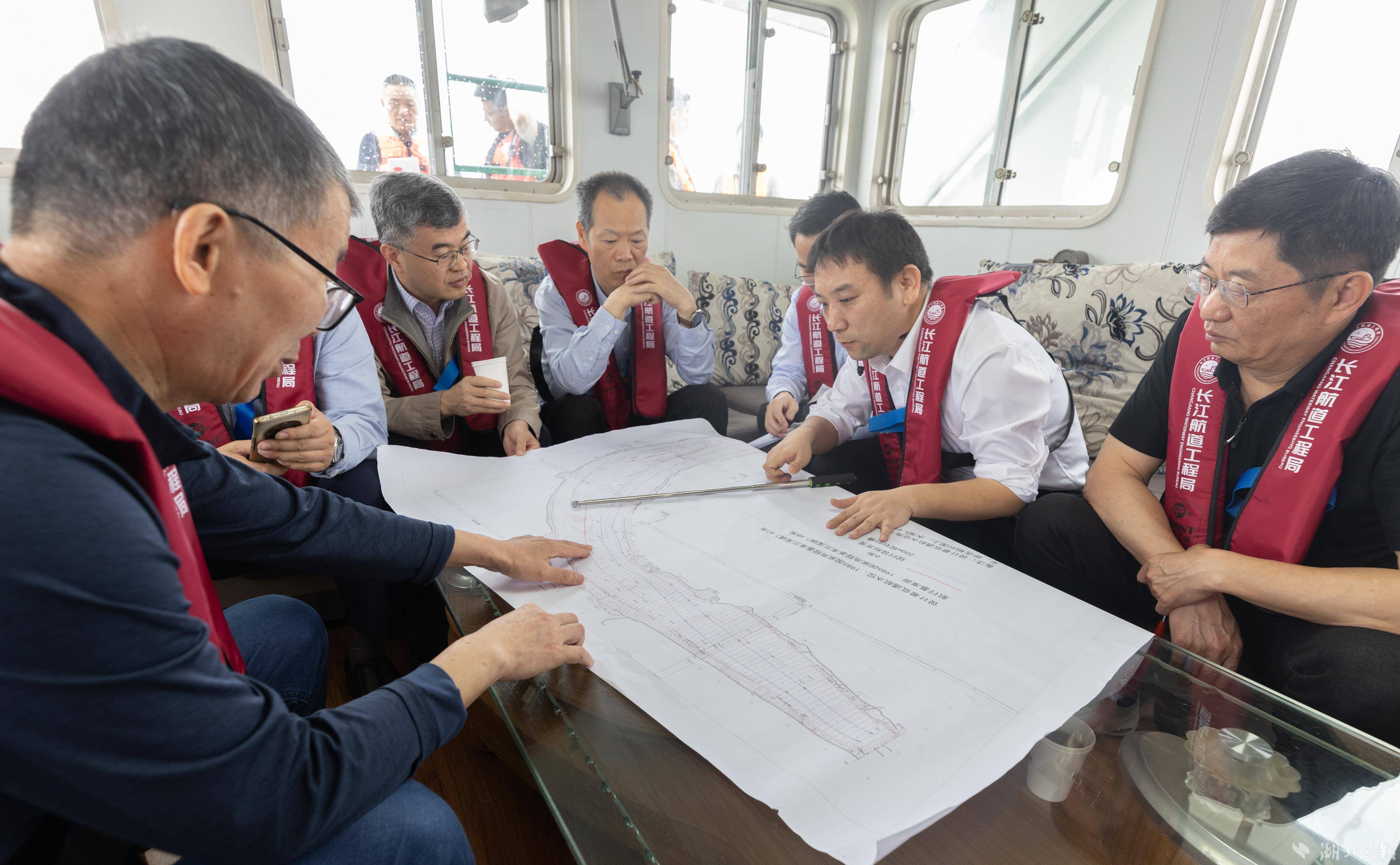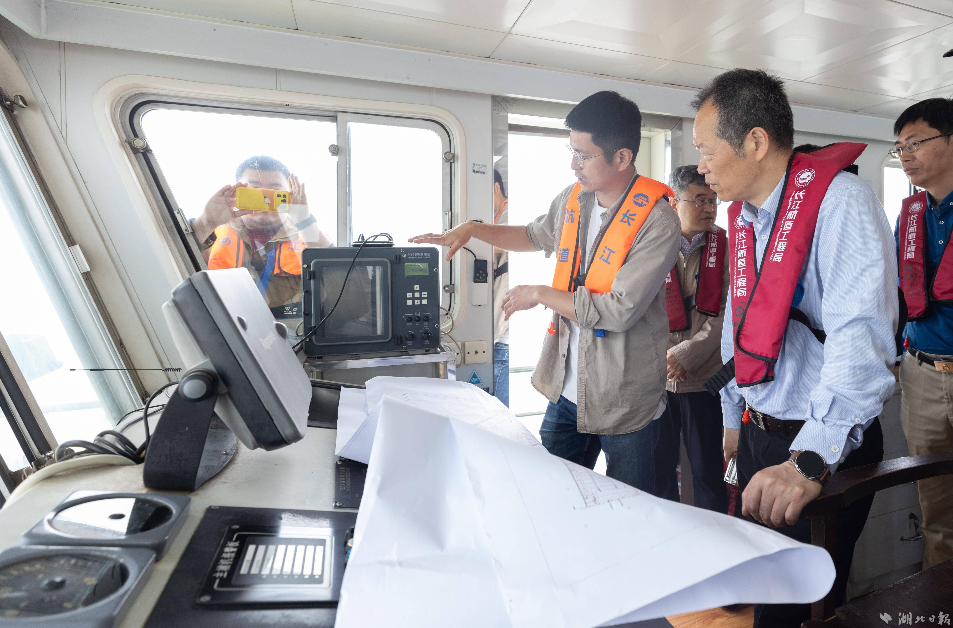 4月28日,长江鄂州段水域,专家组在测量船上审阅图纸资料、对航道进行实地探测。(湖北日报全媒记者 柯皓 摄)