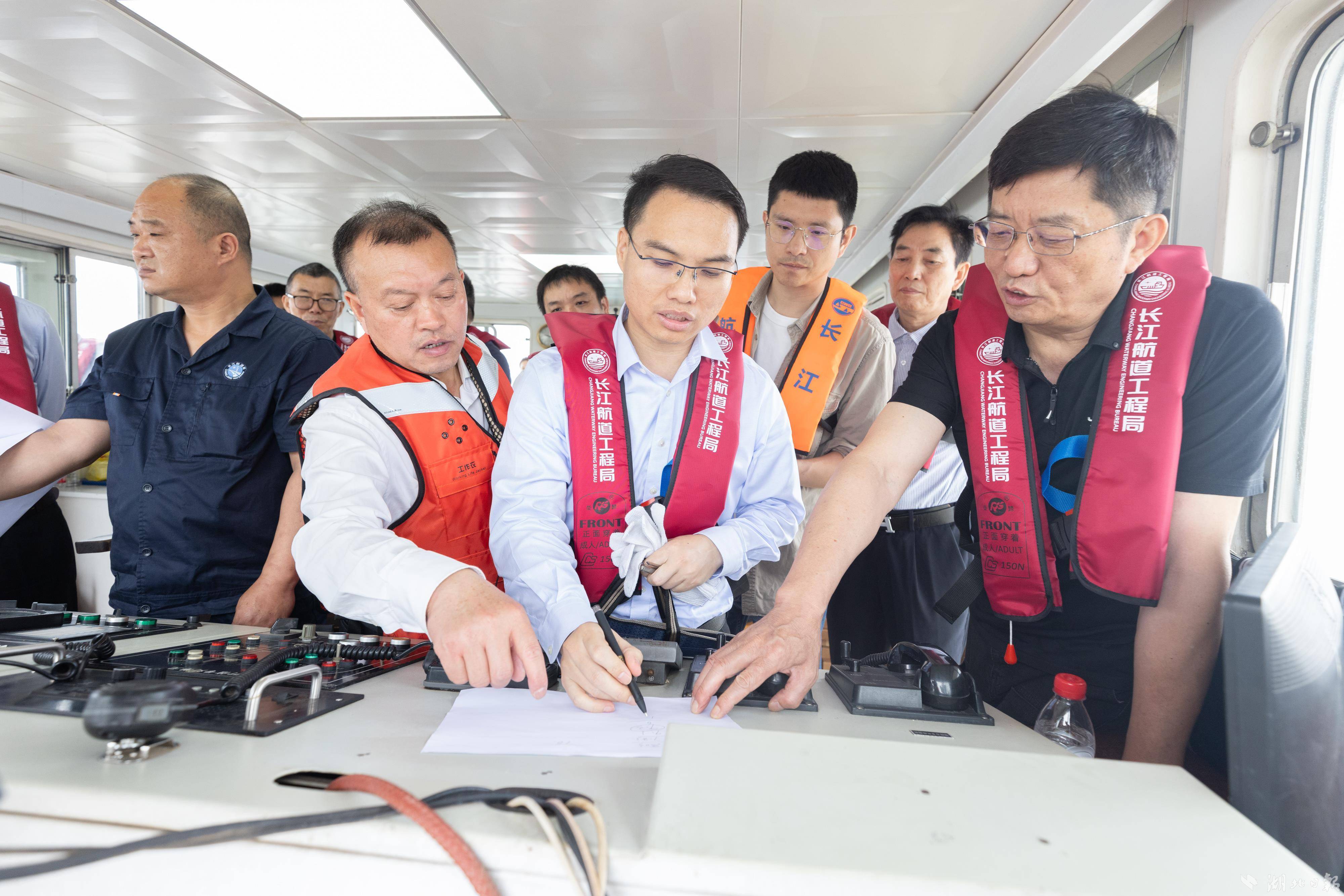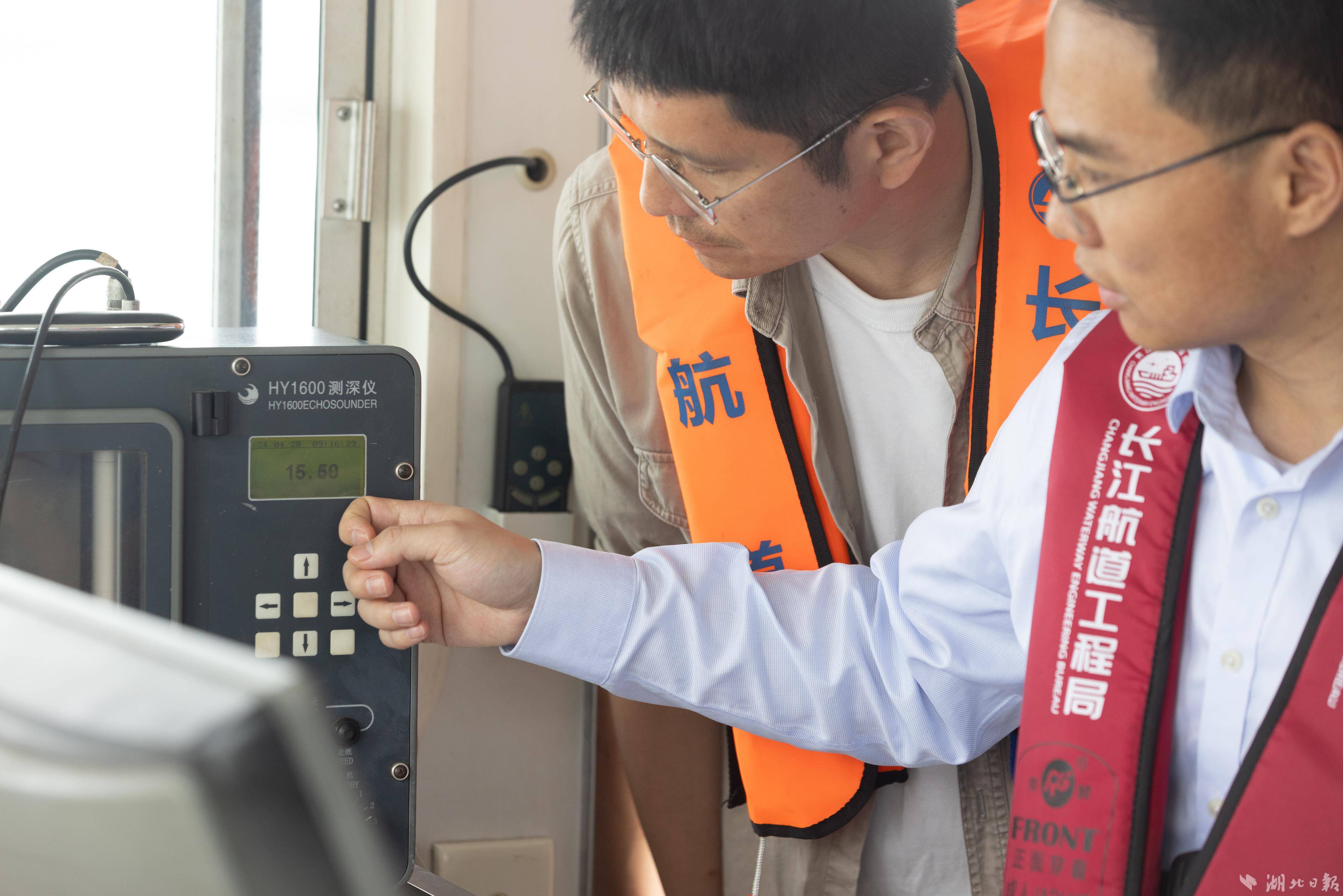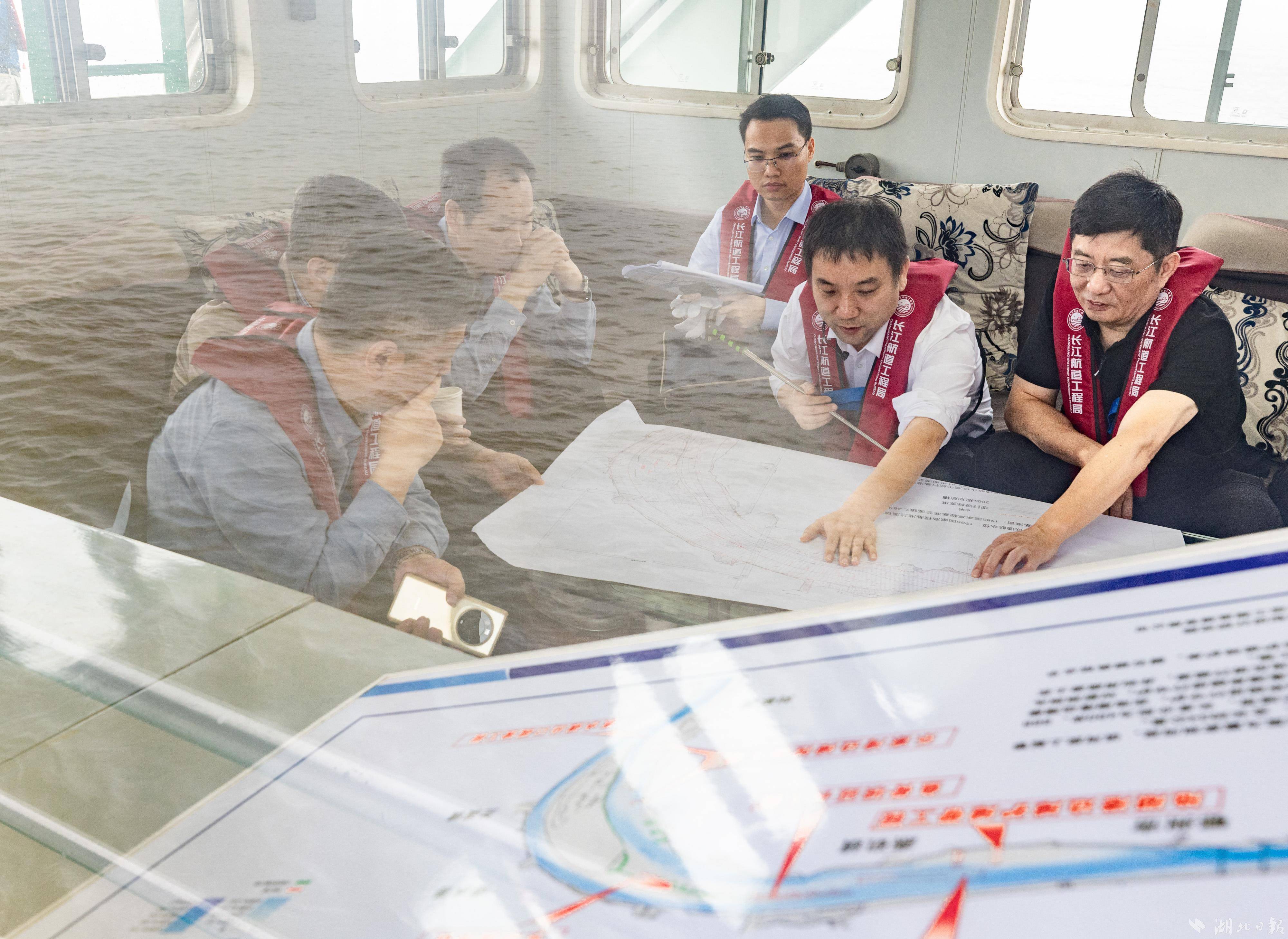 4月28日,长江鄂州段水域,专家组在测量船上审阅图纸资料、对航道进行实地探测。(湖北日报全媒记者 柯皓 摄)
