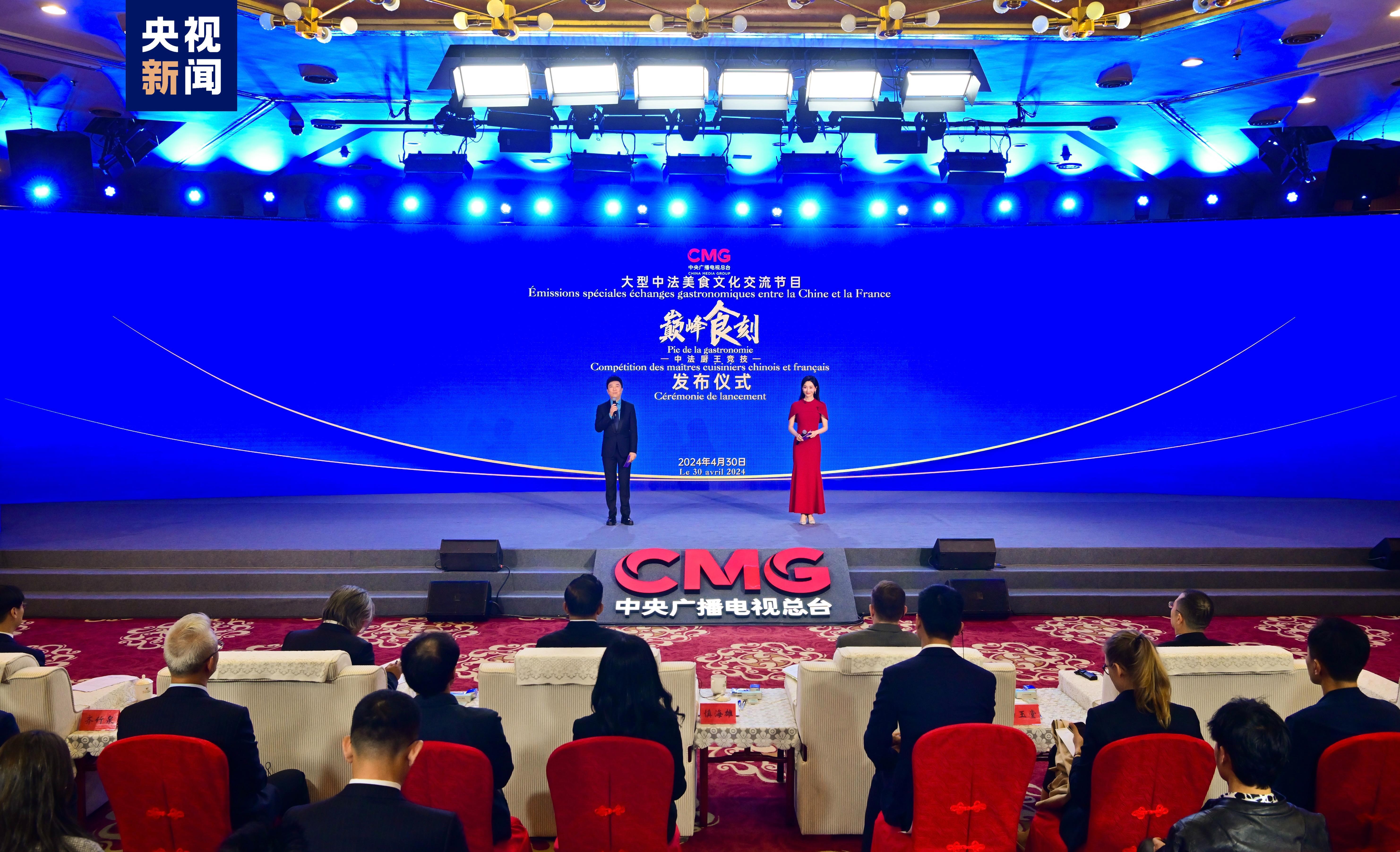 在中国国家主席习近平即将对法国进行国事访问之际,4月30日,中央广播电视总台与法国驻华大使馆联手,以美食为名,以文化为媒,推出大型中法美食文化交流节目《巅峰食刻——中法厨王竞技》。中宣部副部长、中央广播电视总台台长慎海雄,法国驻华大使白玉堂,民盟中央副主席、中国美术馆馆长、法兰西艺术院通讯院士吴为山在活动上致辞,并与嘉宾共同启动节目发布。