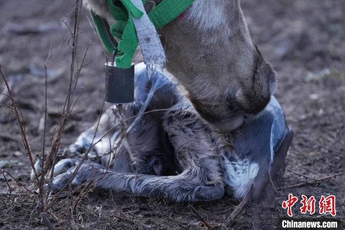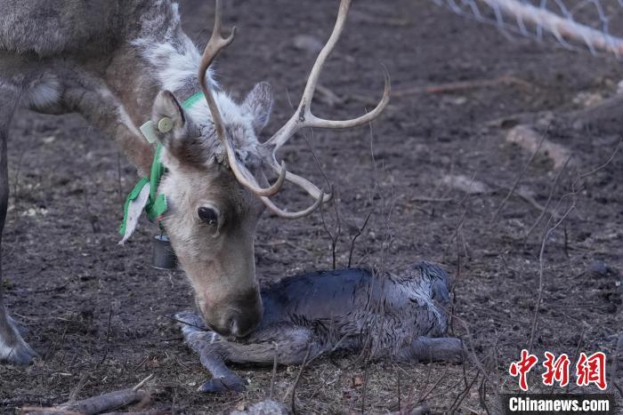驯鹿妈妈舔舐着刚出生的驯鹿宝宝。 王郑胤 摄