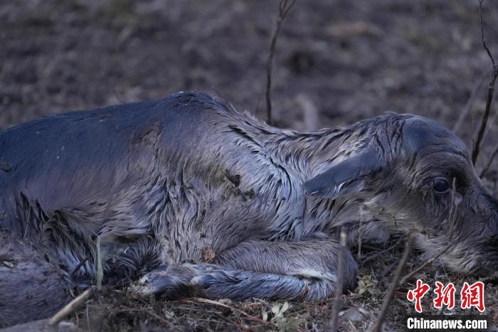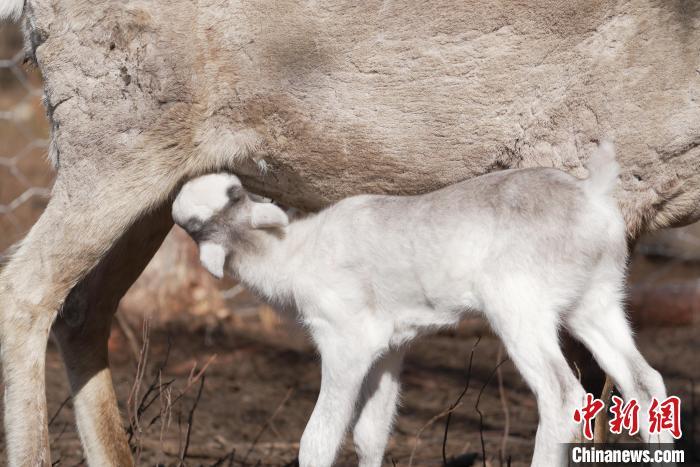刚出生半个小时的驯鹿宝宝已经可以站立吃奶。 王郑胤 摄