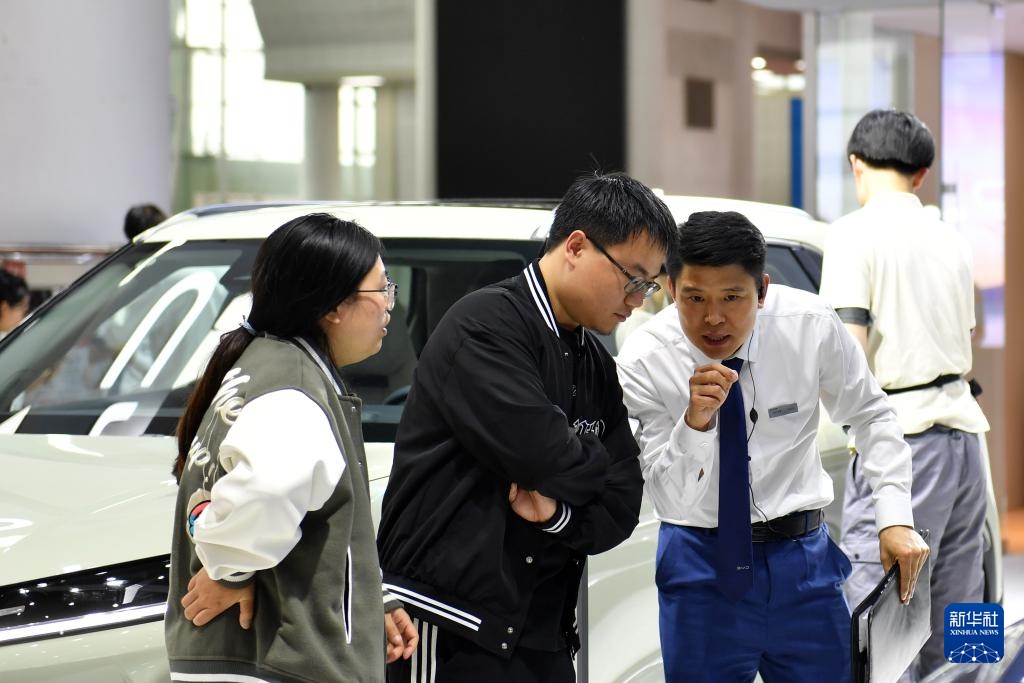 4月30日,工作人员(右一)在2024湖南汽车展览会上向参观者介绍展车信息。