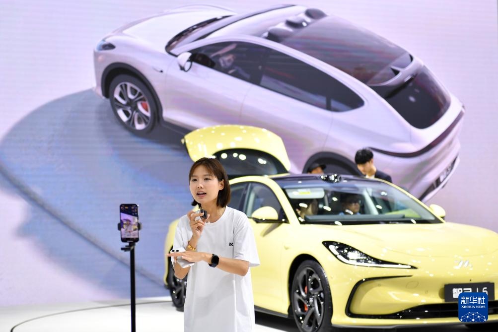 4月30日,工作人员在2024湖南汽车展览会上通过直播介绍展车。